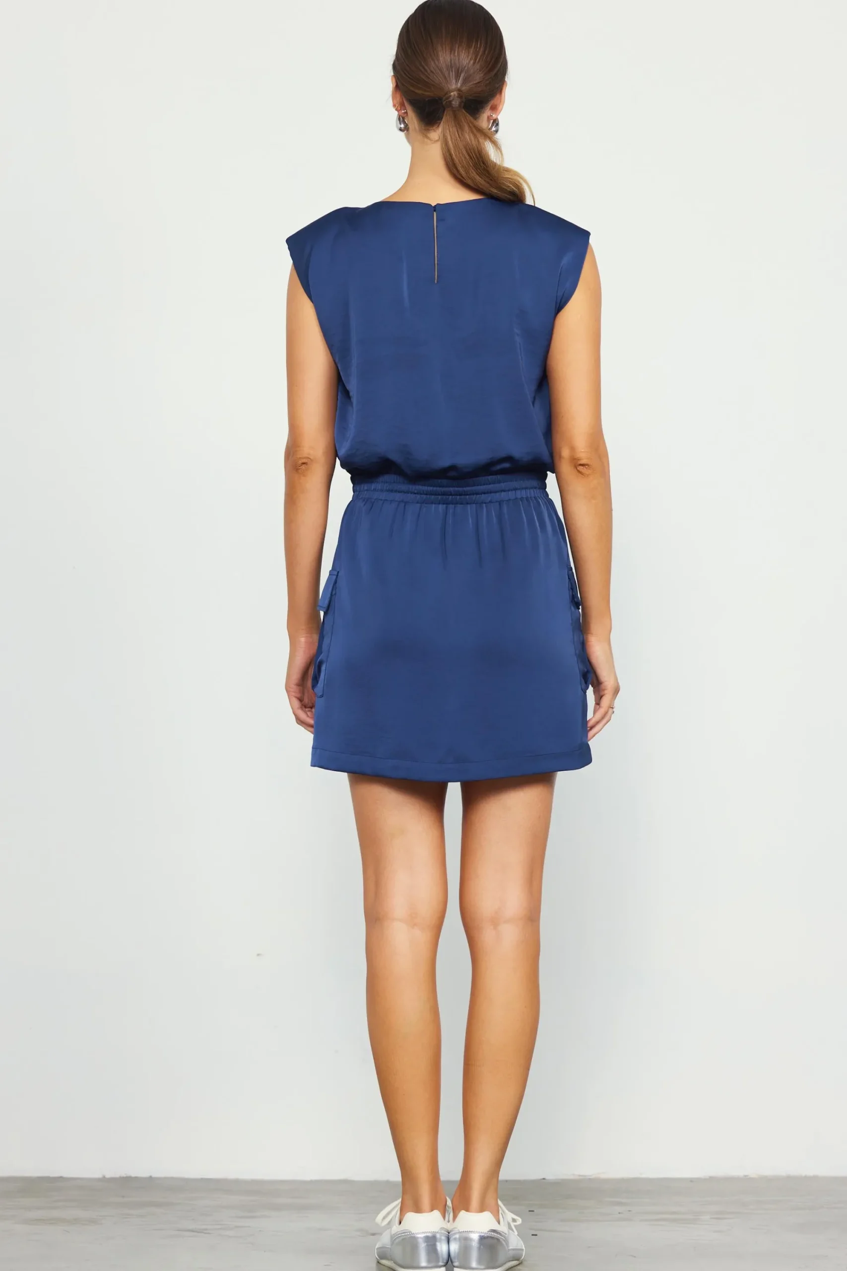 A pared-back mini dress, updated with cargo pockets for a modern utility influence. The relaxed fit is cinched by an elasticized waist and a metal-tipped drawstring.