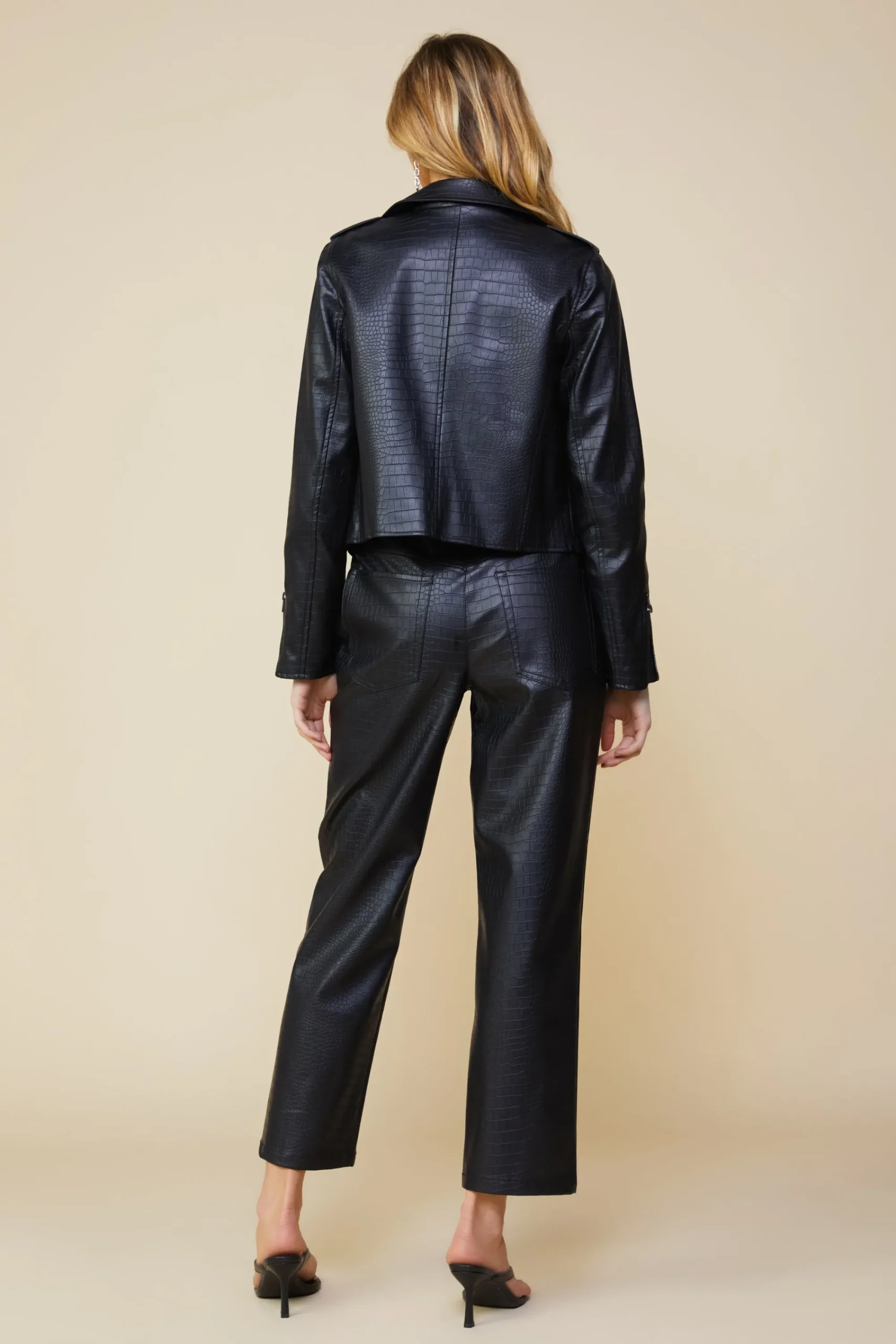 A modern take on the classic biker jacket. Made from embossed vegan leather, this layer-ready style has an open placket, notched lapels, and a storm flap at the front. Exposed zip hardware completes the look.