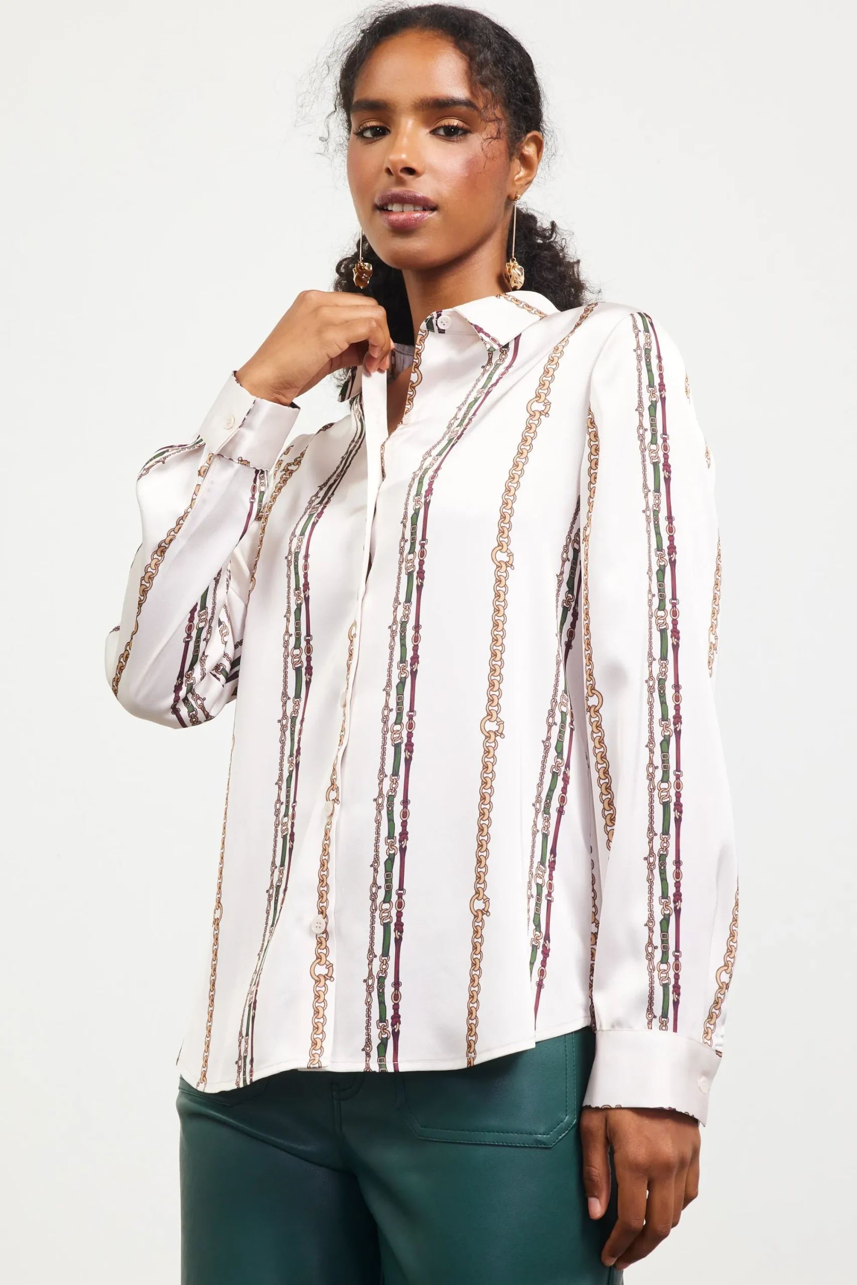 This satin button-down shirt is printed with vertical stripes of illustrated chains. It’s cut for a relaxed fit that’s enhanced by a single inverted pleat at the back.