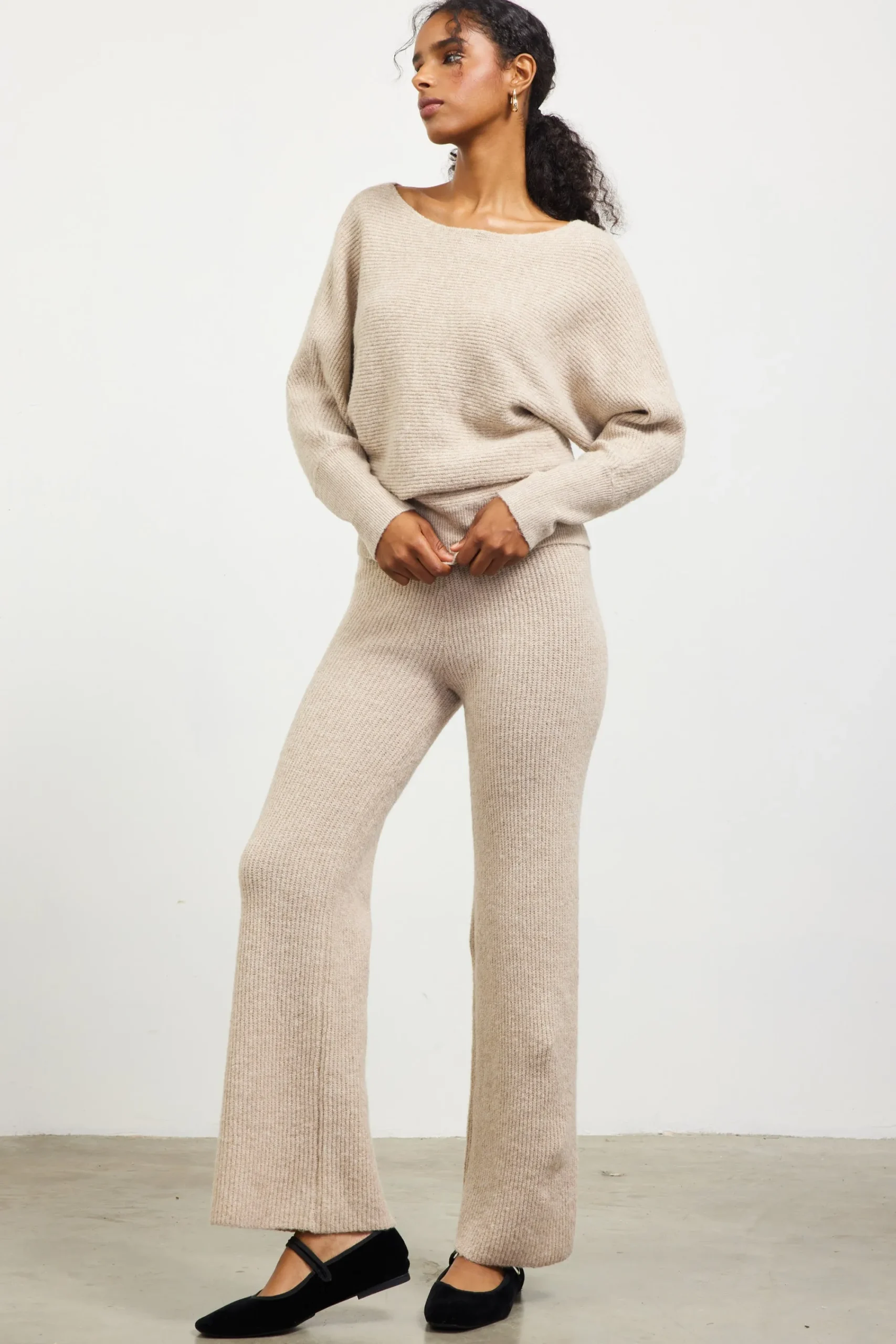Wide boatneck styling displays a hint of collarbone, heightening the allure of this slouchy sweater. Knitted with horizontal rib construction and dolman sleeves, the relaxed fit is drawn in by ribbing at the waist. It’s designed to be worn with our matching wide-leg pants, but you can pair it with jeans or a slinky skirt just as easily.