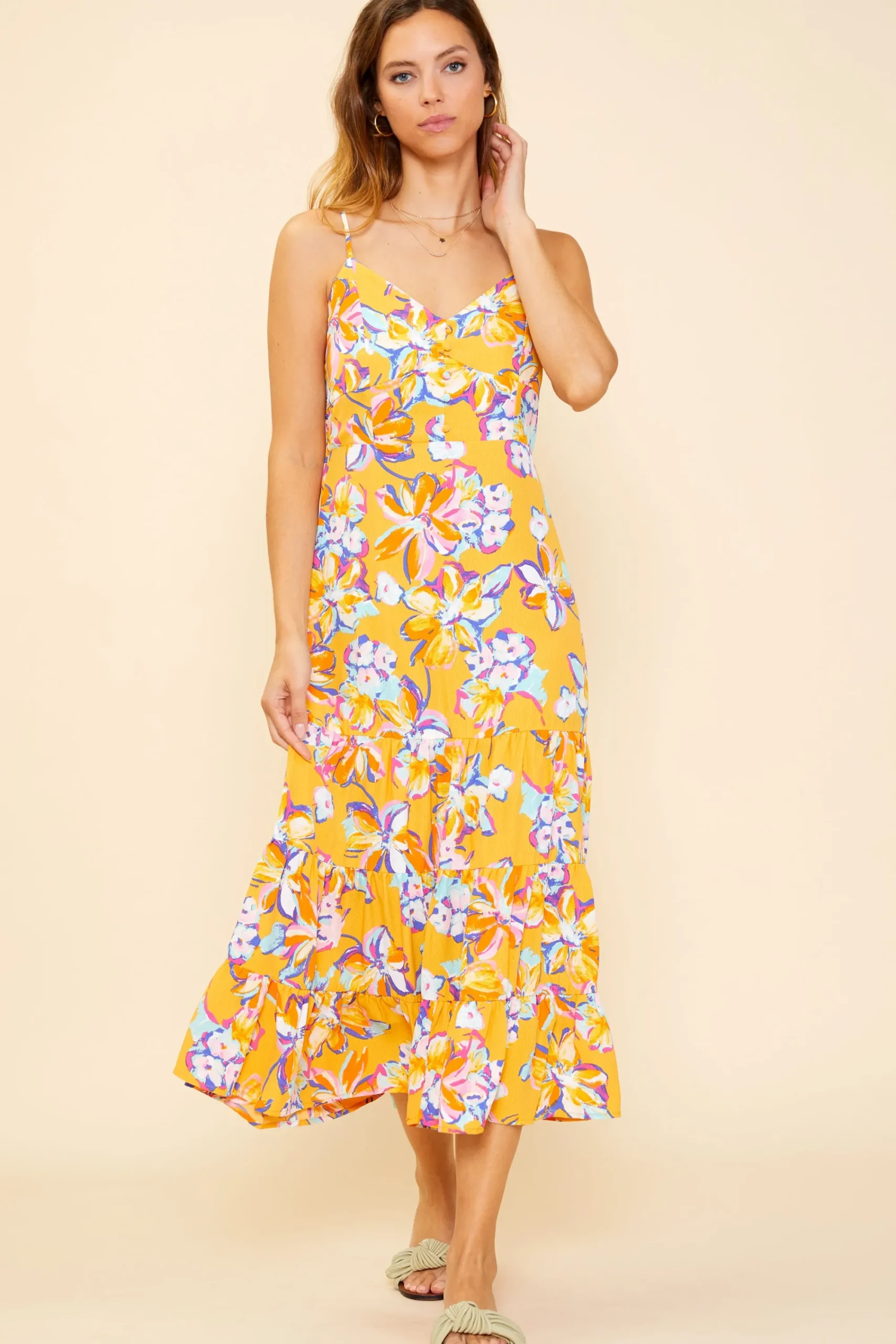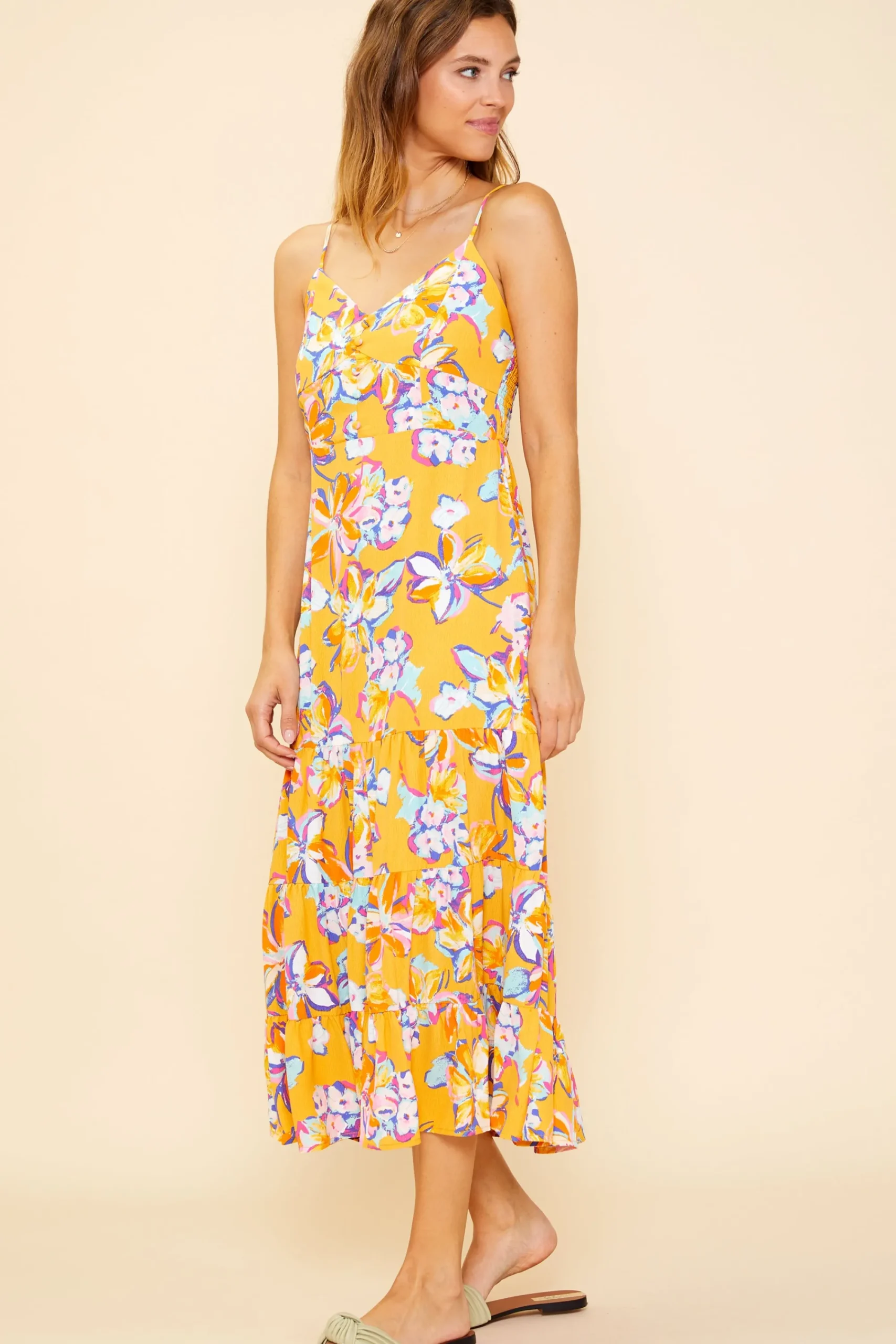 Now’s the time to start wearing more color, and this midi dress delivers. The floral print instantly brightens the season and delivers a playful vibe to the strappy tiered silhouette. Complete with covered buttons at the front and a comfortable smocked back.