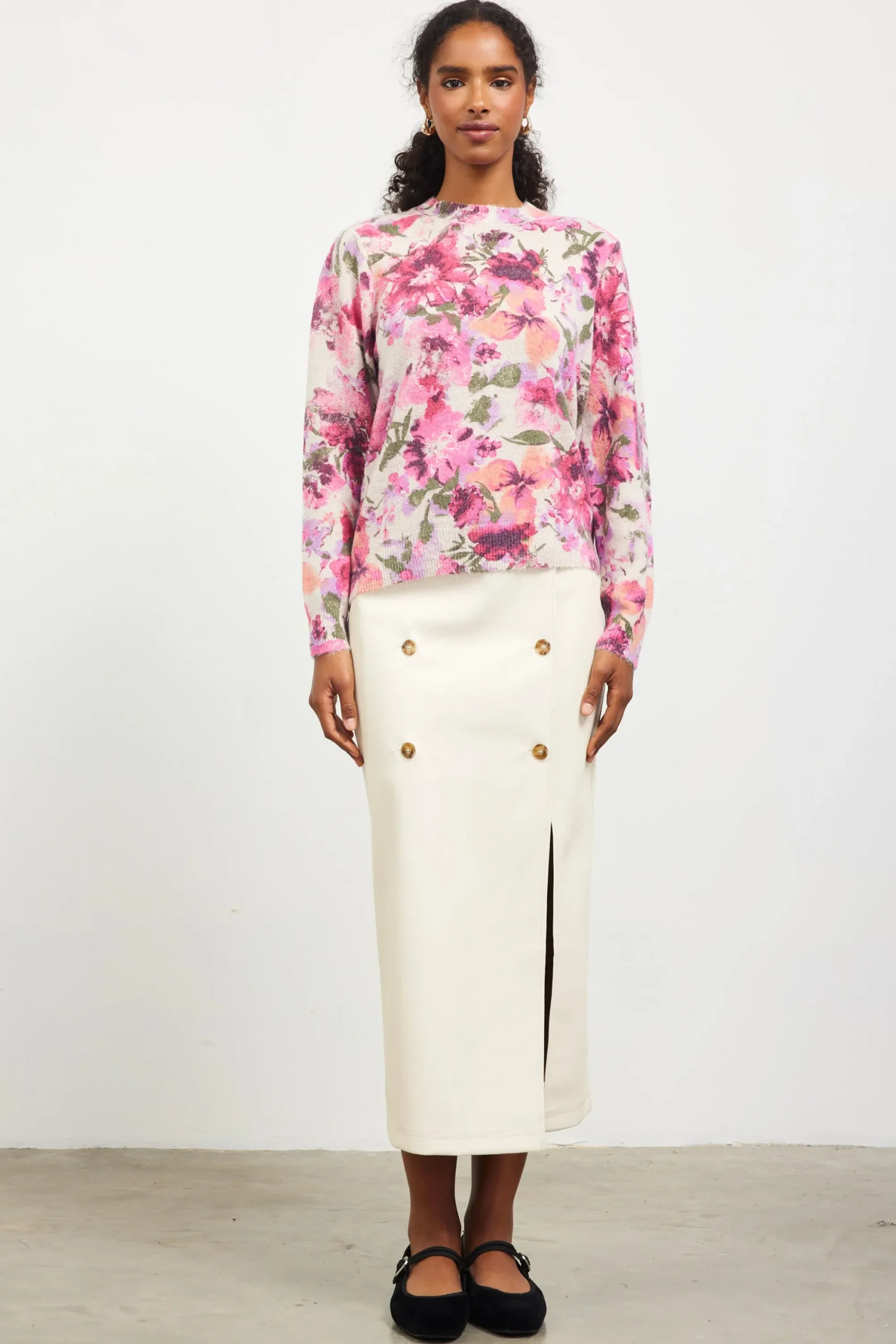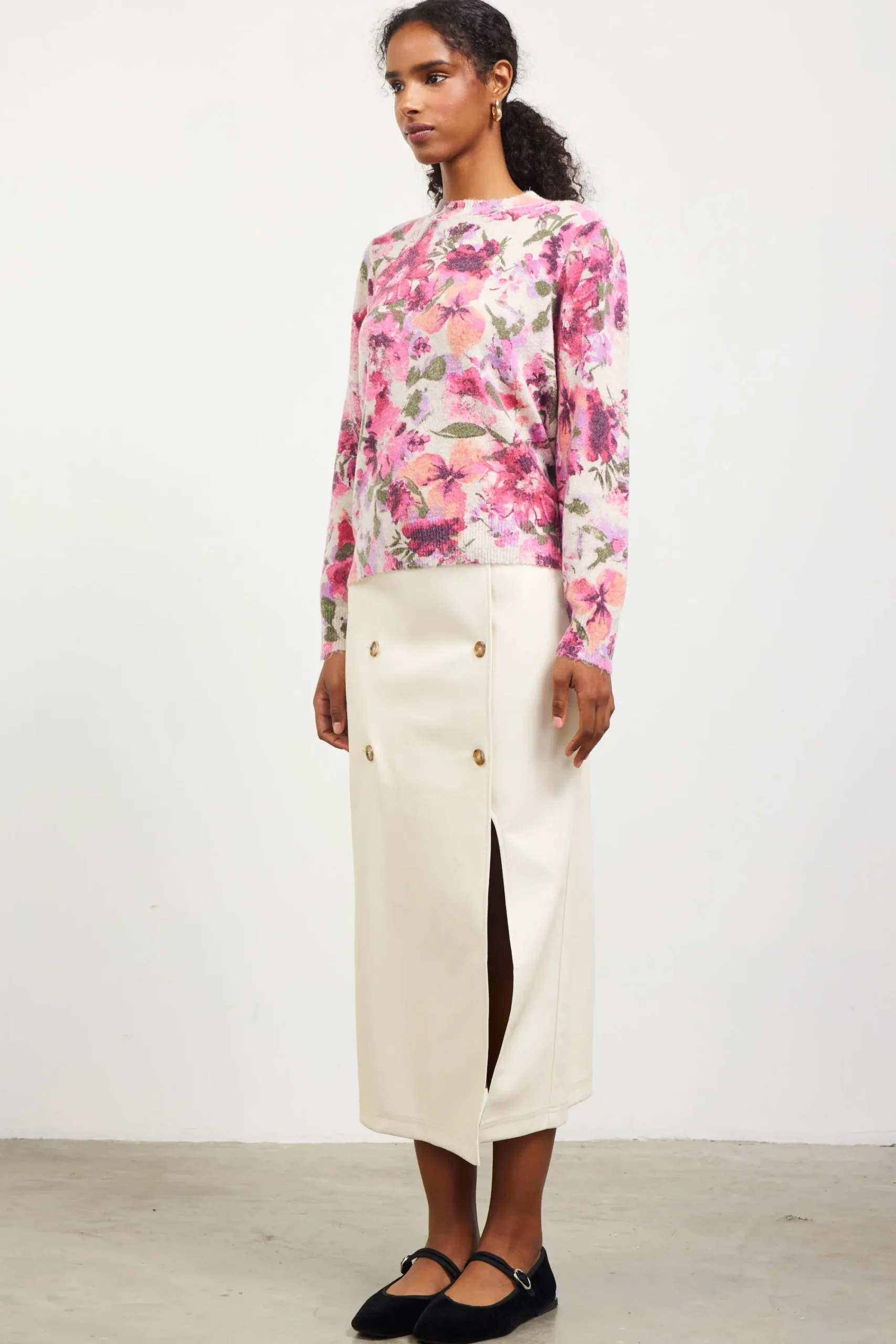 This long-sleeve sweater is printed with a vintage-inspired floral motif and features a slightly fuzzy texture. The back delivers a dose of the unexpected: it’s got surplice styling and a keyhole that buttons at the nape of the neck.