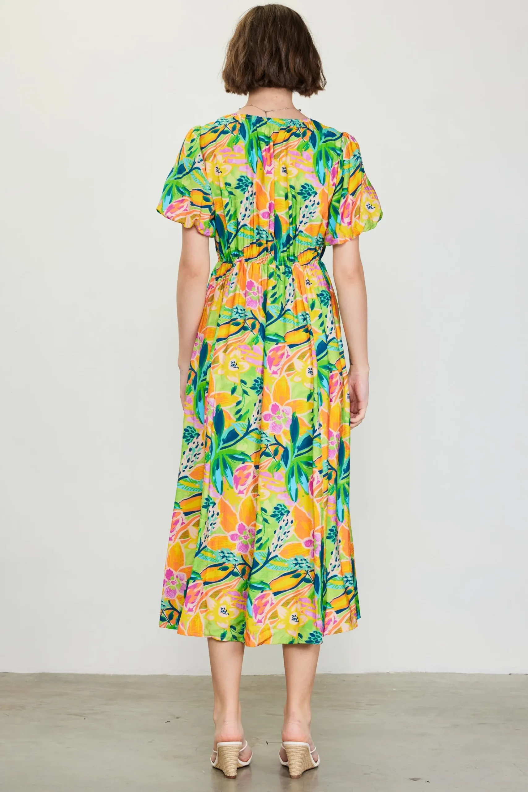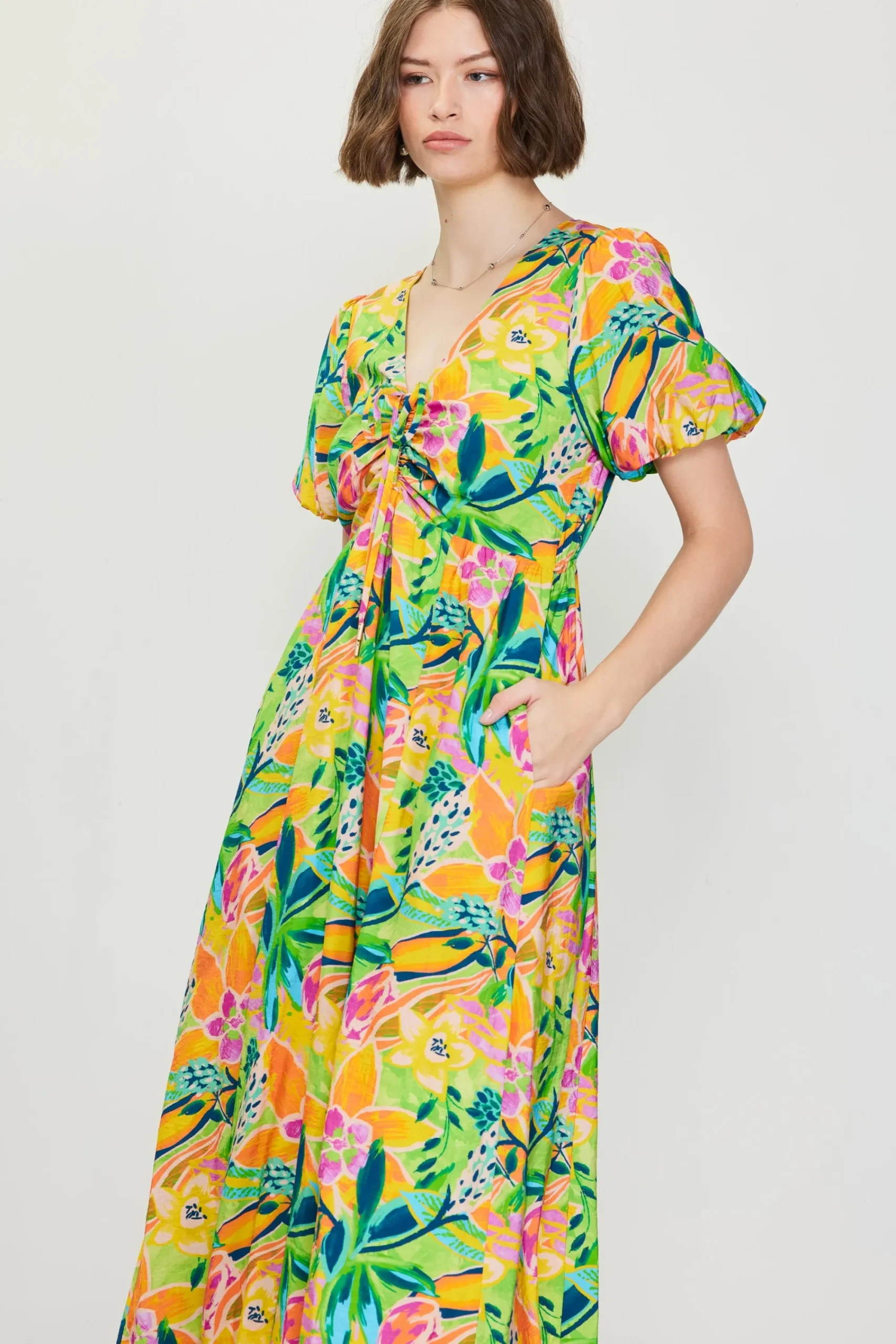 A color palette of mood-boosting brights enlivens this floral-printed midi dress. Framed by voluminous bubble sleeves, it’s got a V-shaped neckline with tie detailing that lets you adjust the fit of the bodice.