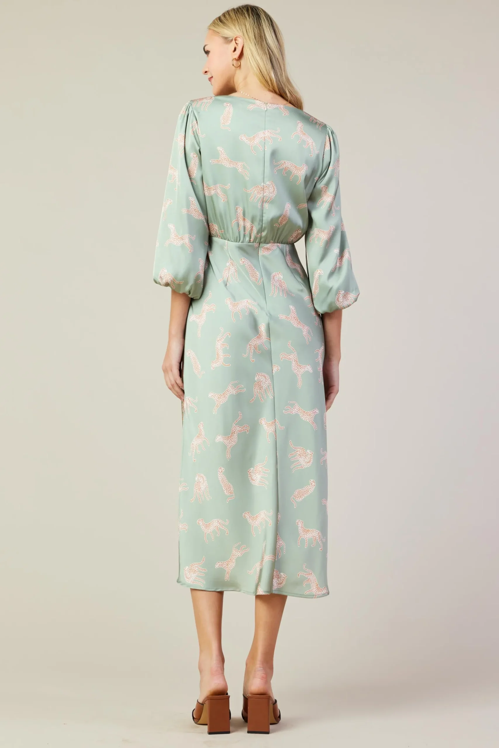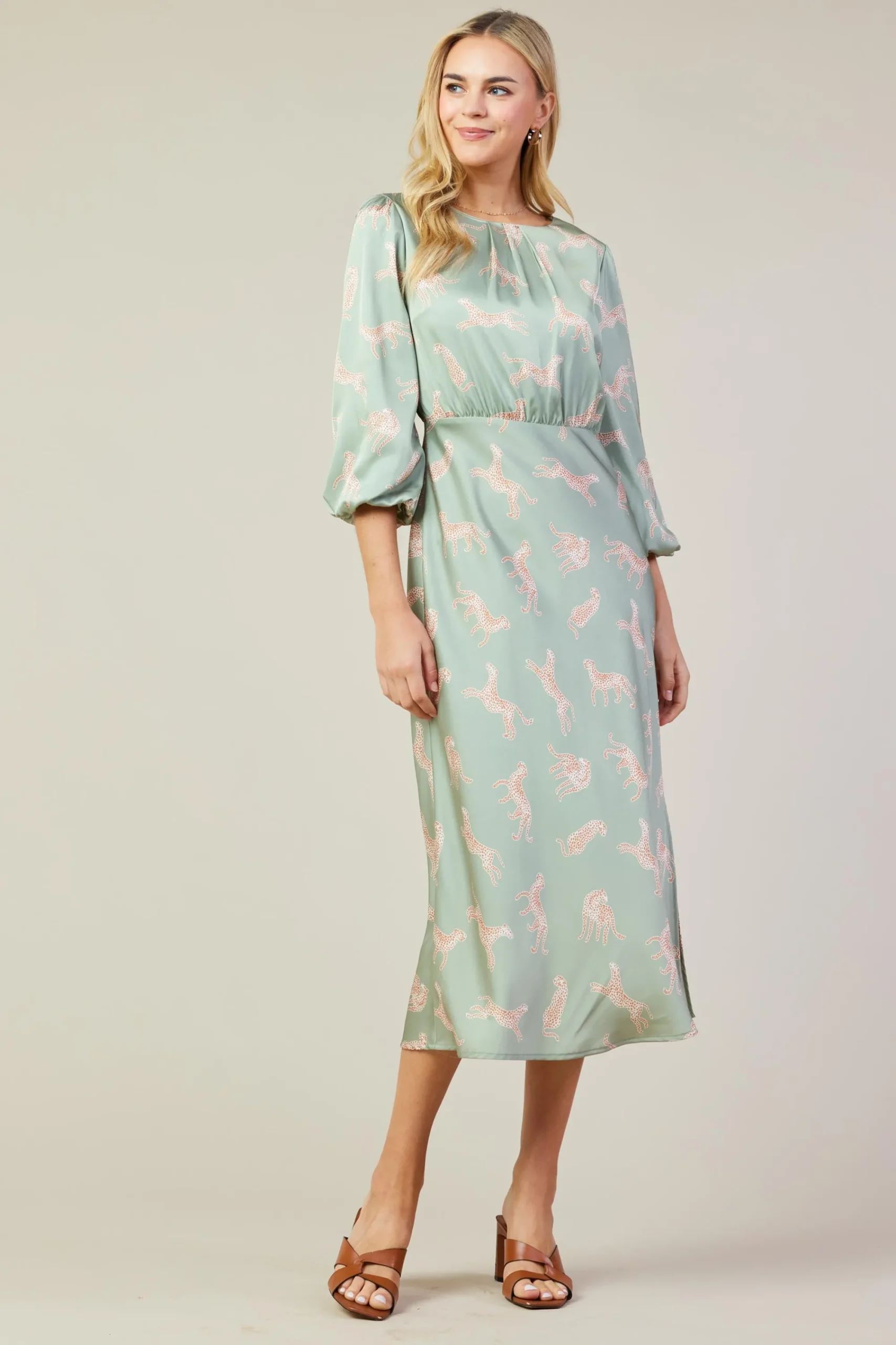 With that whimsical cheetah print, this sage-green midi dress has charm in spades. But also there’s a sense of elegance thanks to the demure pleated neckline, billowy sleeves, and shin-skimming hem.