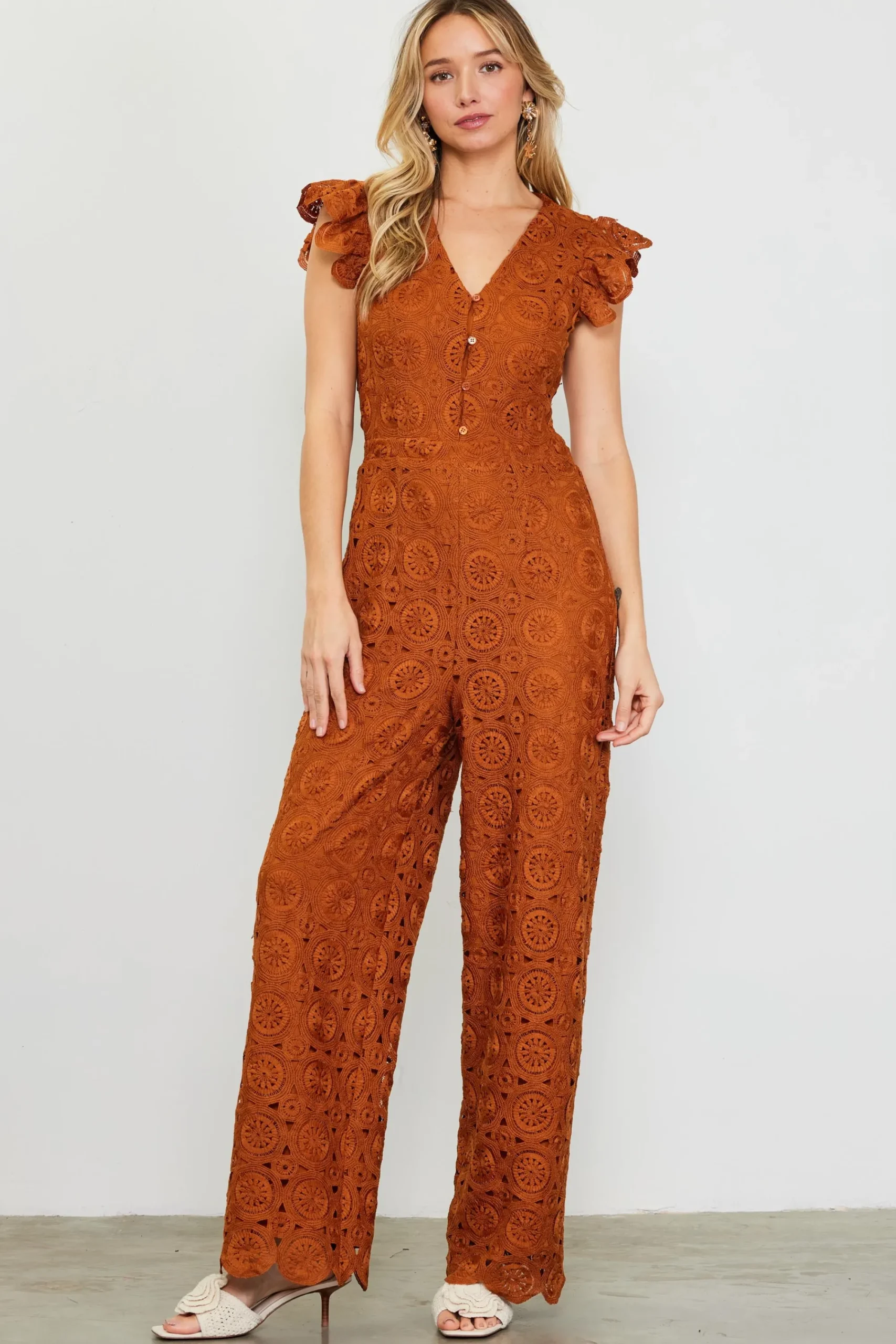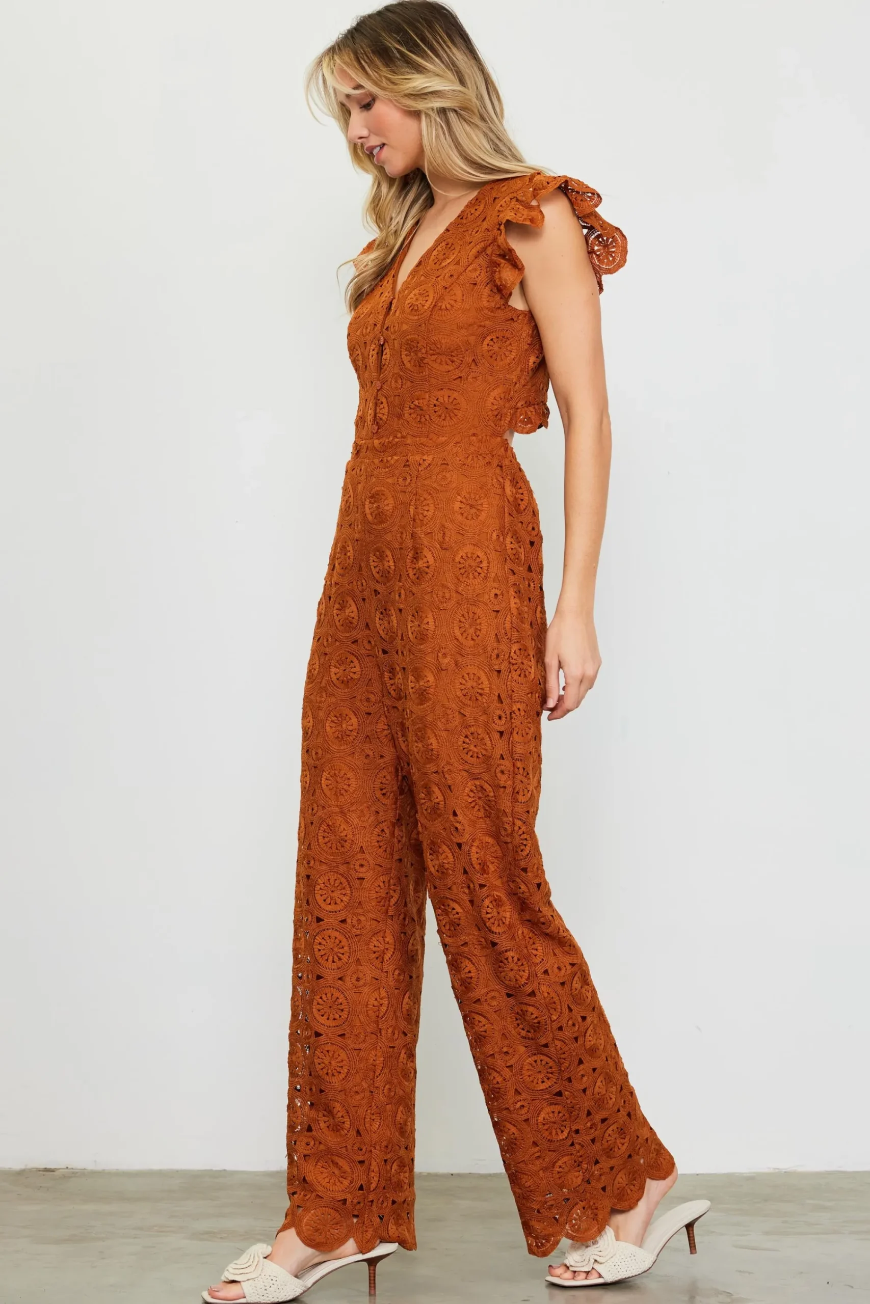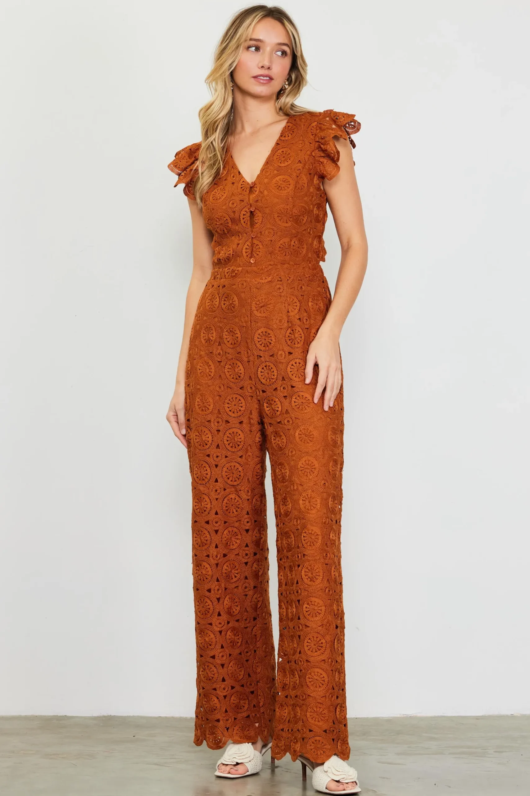 A crochet overlay adds texture and femininity to this V-neck jumpsuit. Accented by ruffled short sleeves and buttons down the front, it’s fitted on top and kicks out to a wide-leg silhouette with scalloped edges. At the back: buttons that echo the front, plus an unexpected cutout for a peek of skin. The elasticized back waistband keeps it comfortable.