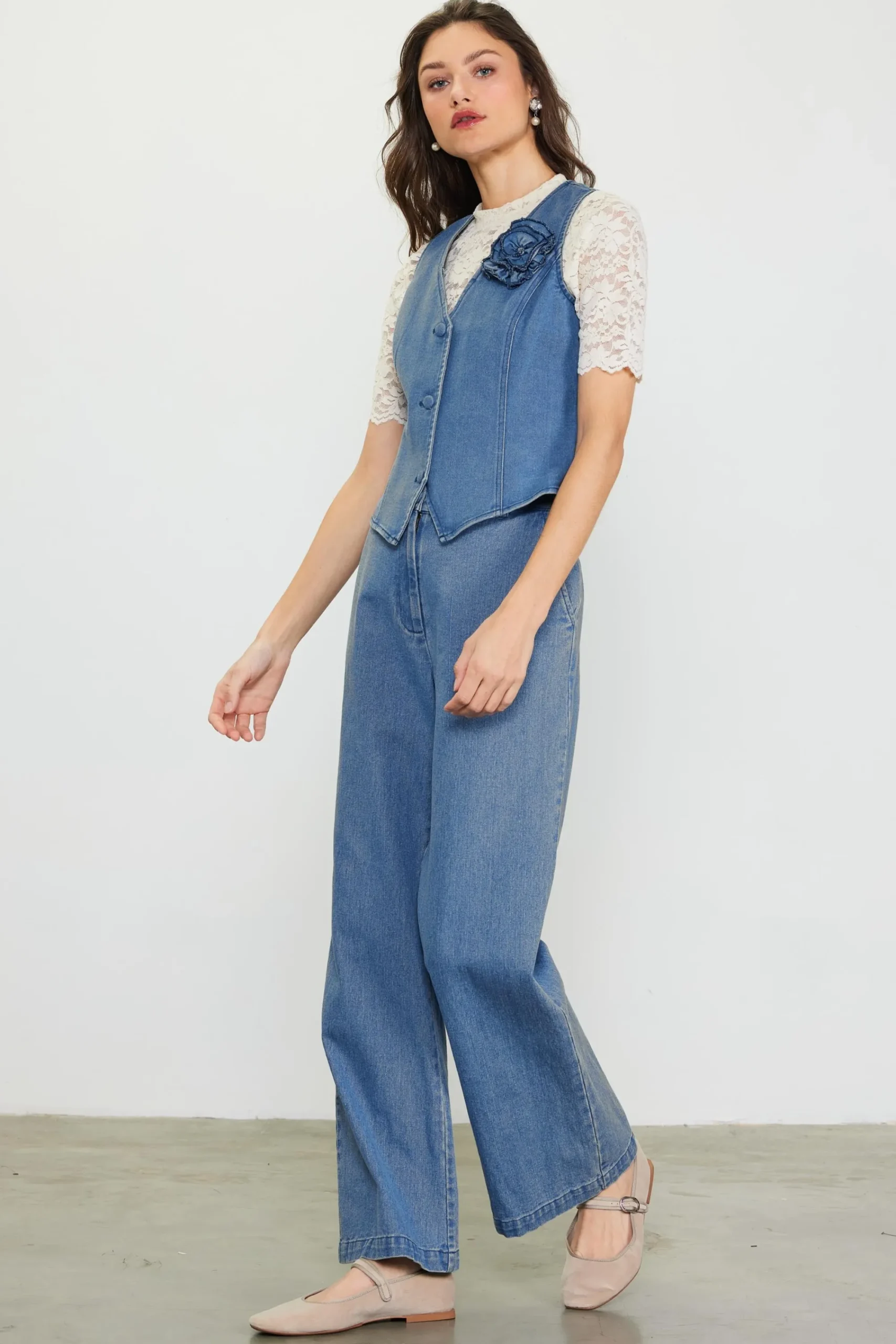 This fitted denim vest offers a cool, casual approach to tailored style. Done in a light blue wash with a bit of fading, it features matching covered buttons and a sweet rosette for a feminine touch.