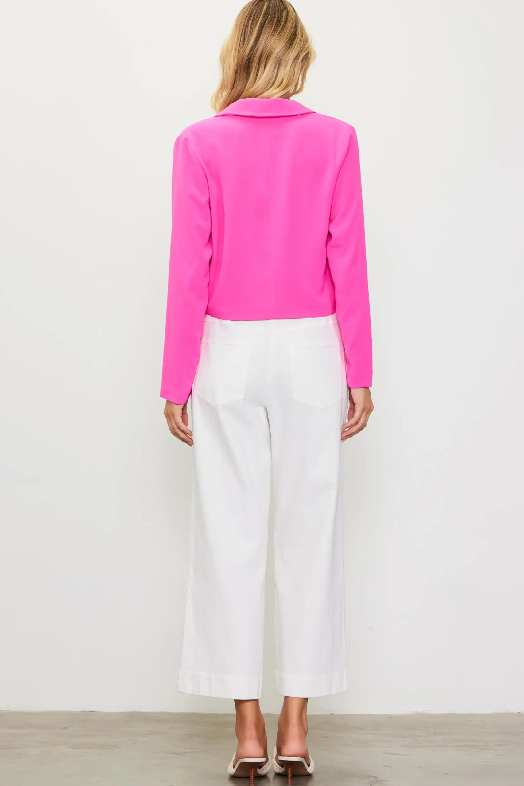 A double-breasted blazer elevates your ensembles with a tailored touch. It’s cropped and boxy, showcasing notched lapels, a single chest pocket, and covered buttons at the front. Add a matching pair of wide-leg pants for a look you can take to work or out to dinner.
