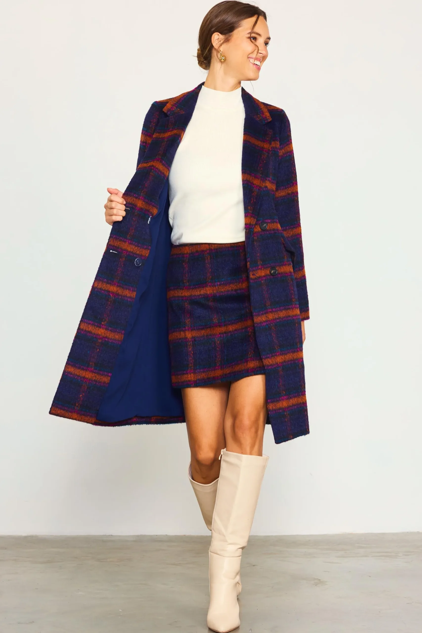 A long coat with double-breasted styling is classic, sophisticated, and wears well with everything—a true cold-weather staple. This version features a plaid motif in a soft, fuzzy texture.