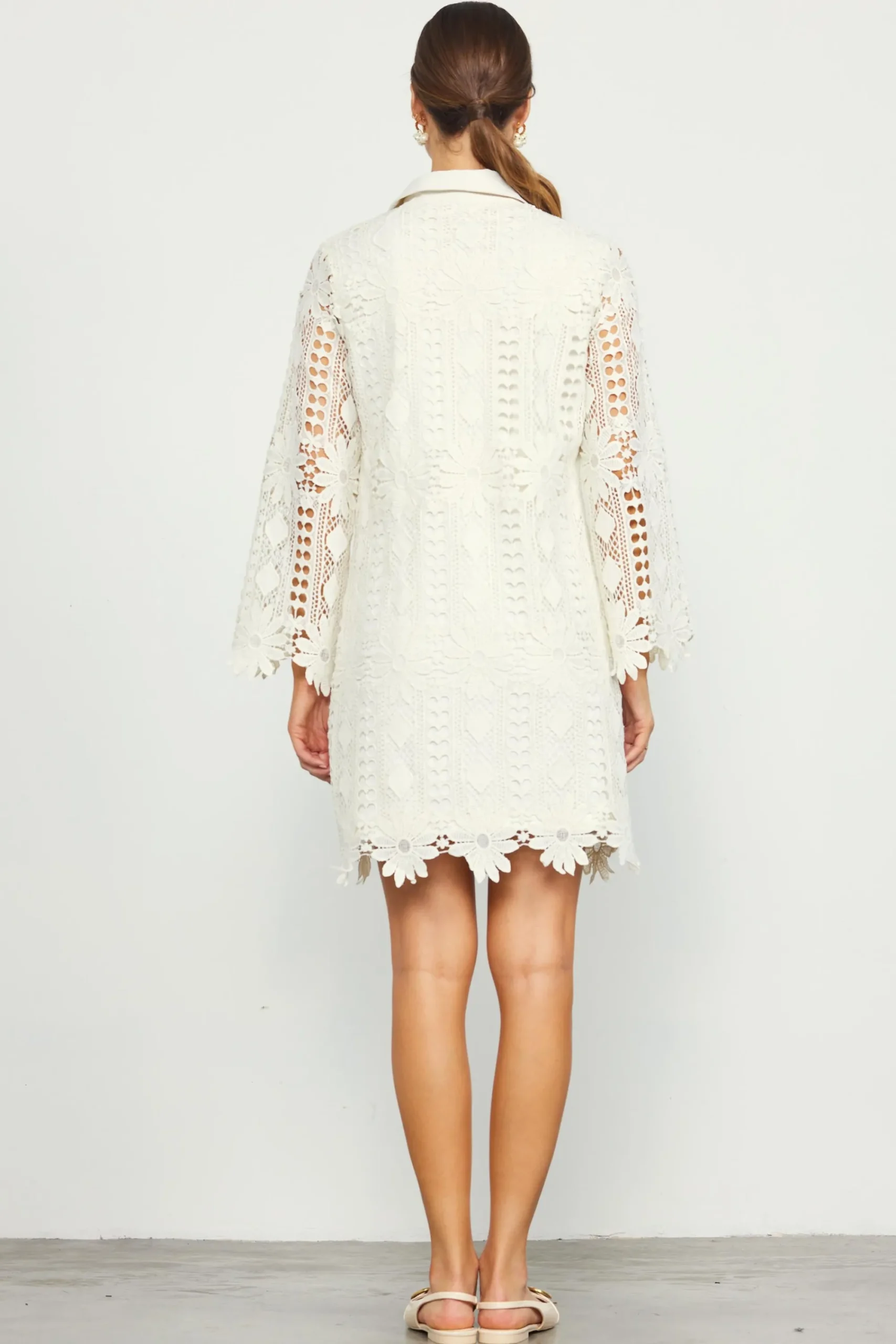 Light and airy in embroidered eyelet lace, this long-sleeve mini dress has a richly textured design. The floral motif enhances its charm, and the scalloped hem adds a unique touch. A pointed neckline and a half placket with silver-tone buttons tops the look.