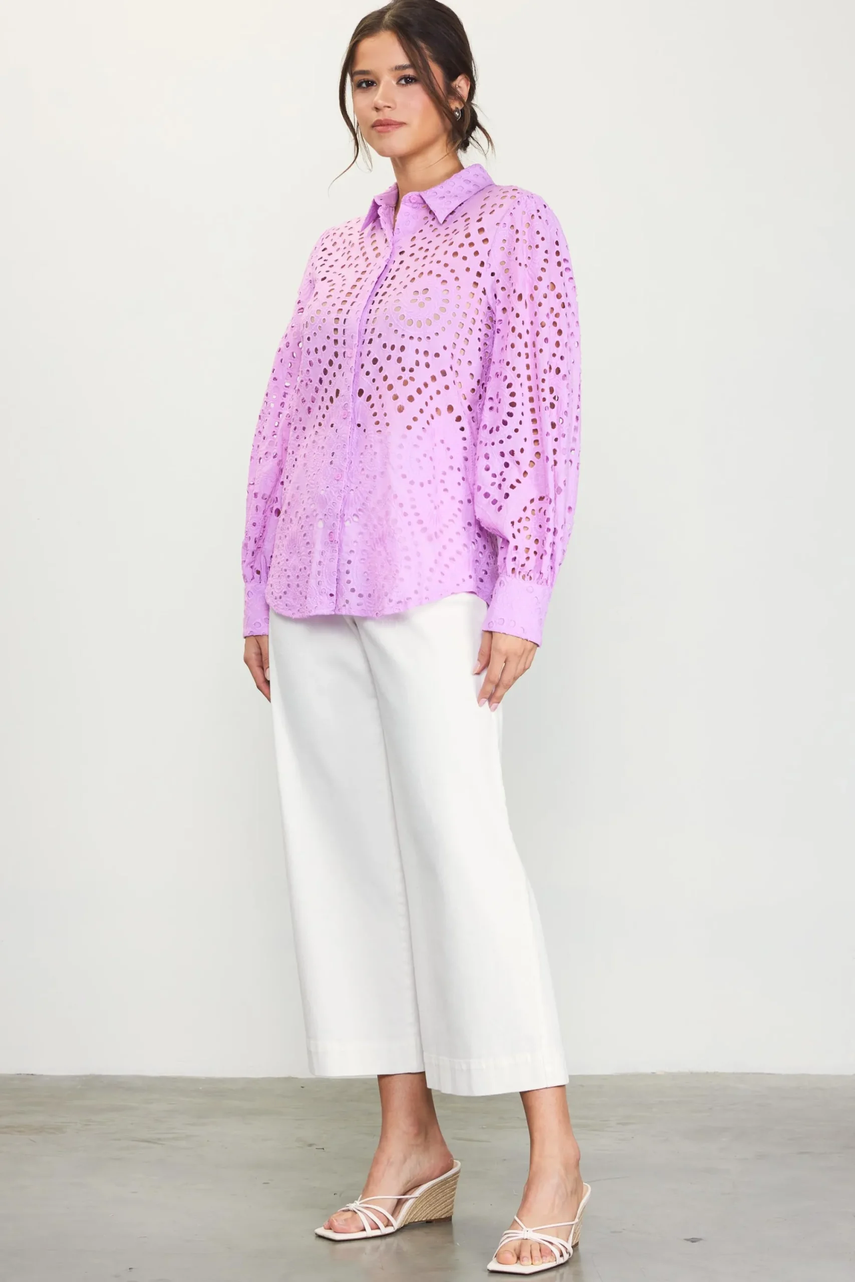 Embroidered eyelets create a peekaboo effect on this airy long-sleeve blouse. Button it up over a tonal cami or layer it on top of your swimwear while on holiday.