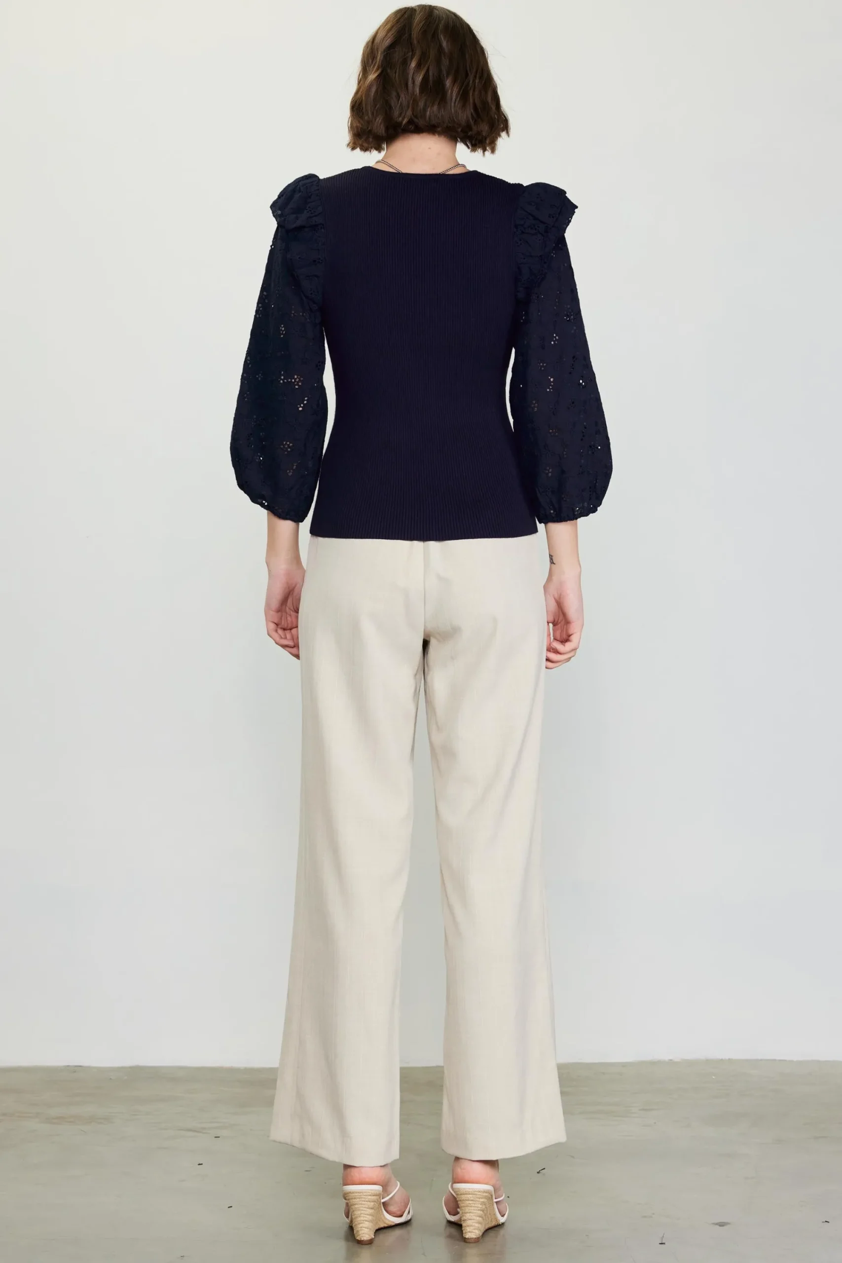 Woven eyelet sleeves frame this scoopneck top made from a comfortable rib knit. Layered ruffles at the shoulders add an extra flourish.
