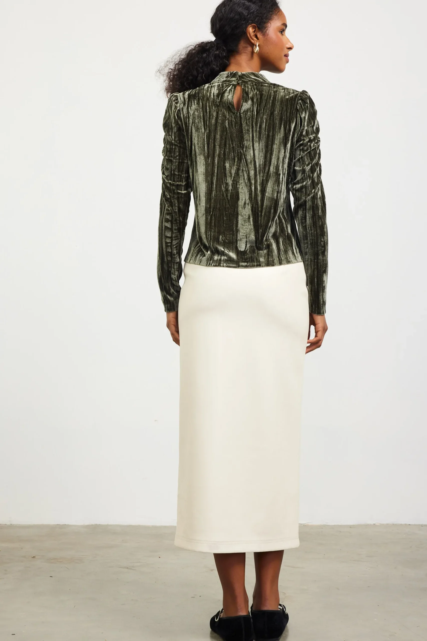 This sleek midi skirt is cut from smooth vegan leather and features double-breasted styling with buttons at the front. Accented by a matching buckle belt, it sits high on the waist and falls to a shin-length hem.