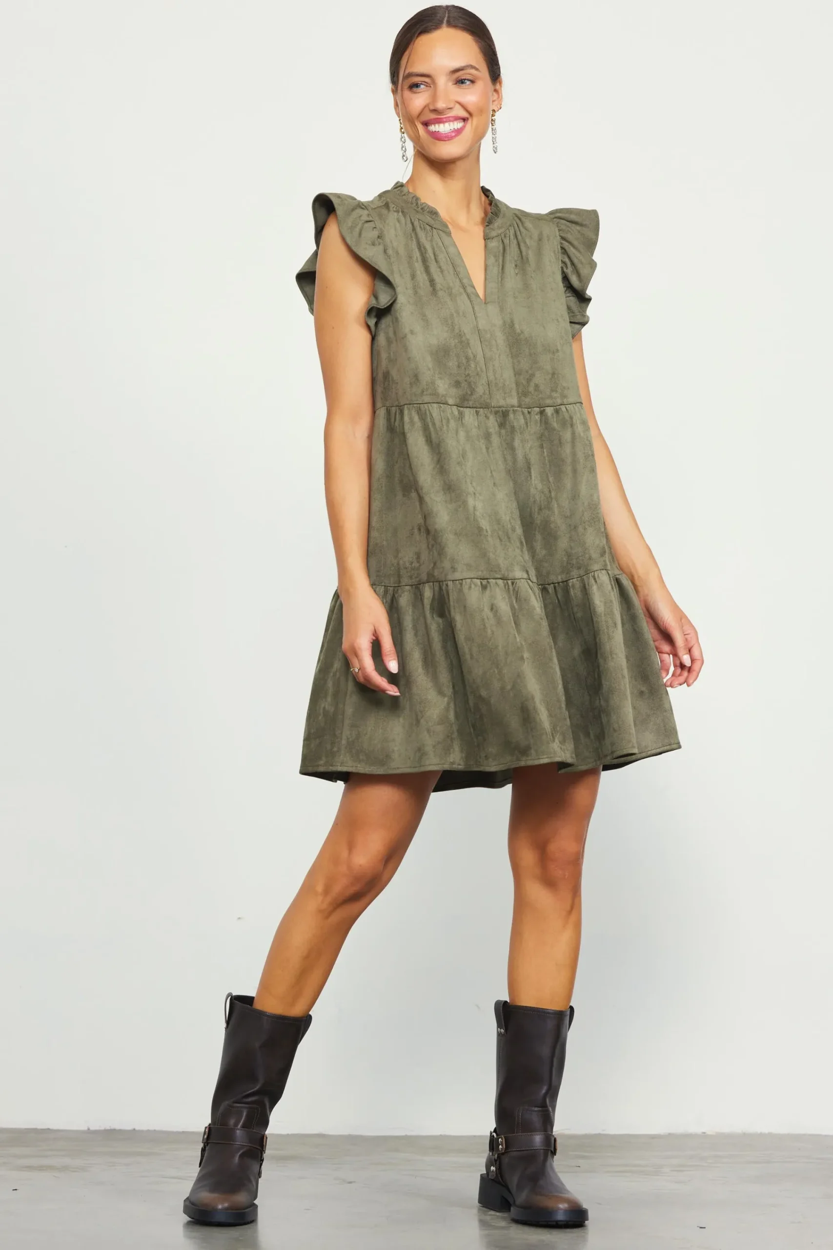 Soft to the touch in faux suede, this tiered mini dress has a relaxed silhouette with lots of movement. The details are so feminine: a split neckline with ruffle trim, fluttery sleeves, and gentle gathers throughout.