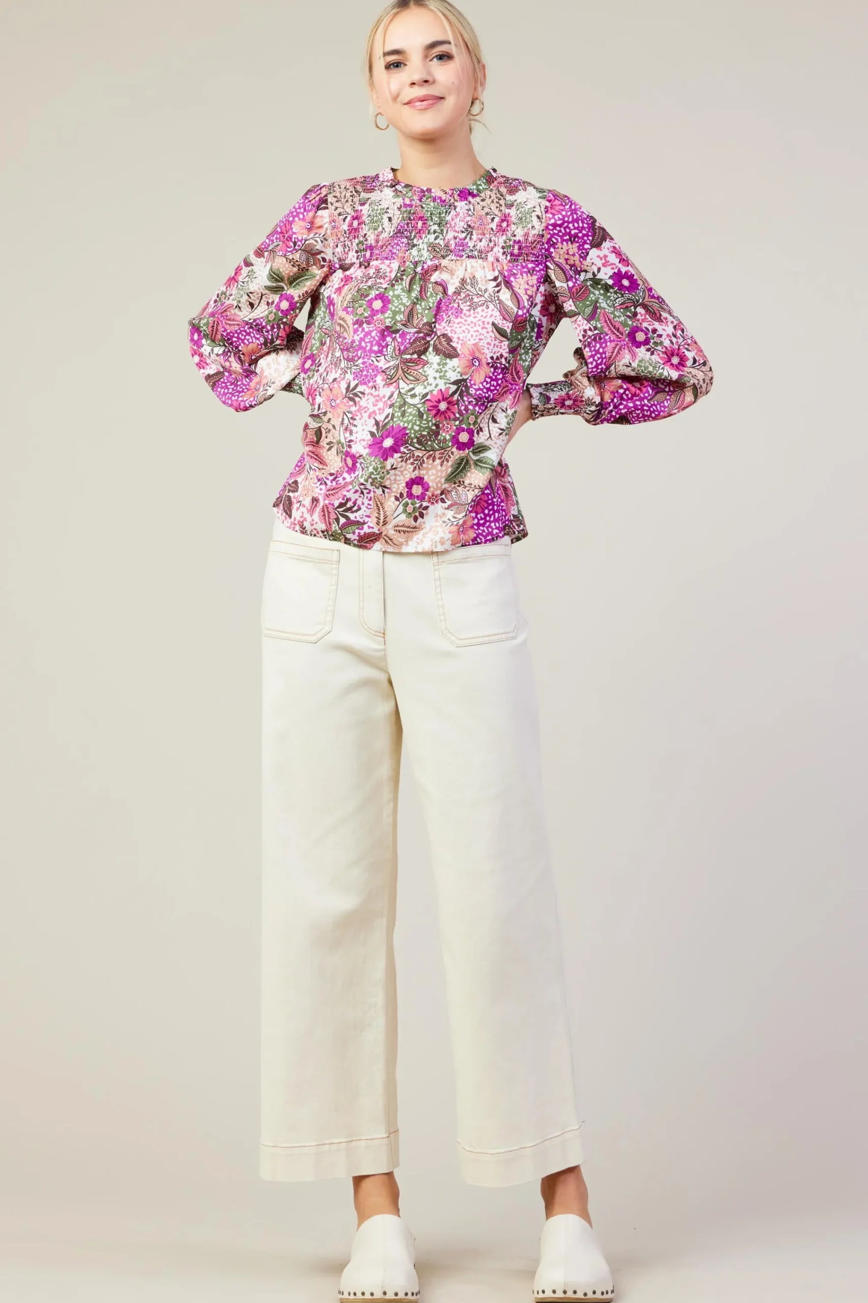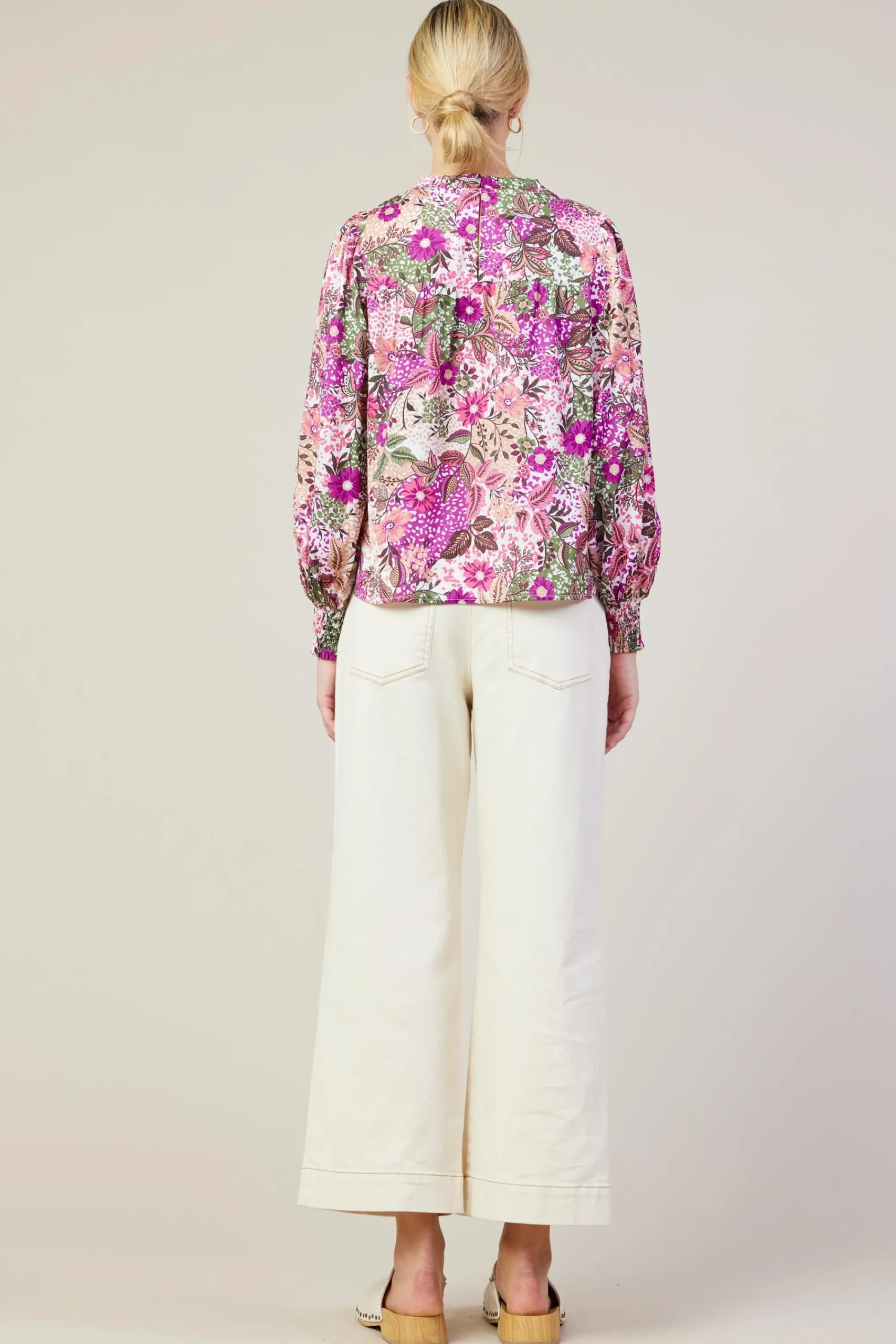 This blouse has a ruffle-trimmed neckline, a smocked yoke, and long, puffed sleeves with smocked cuffs, plus a keyhole at the back. The print here is a real vibe—look closely and you’ll see a colorful mix of animal spots set into the retro-inspired floral.
