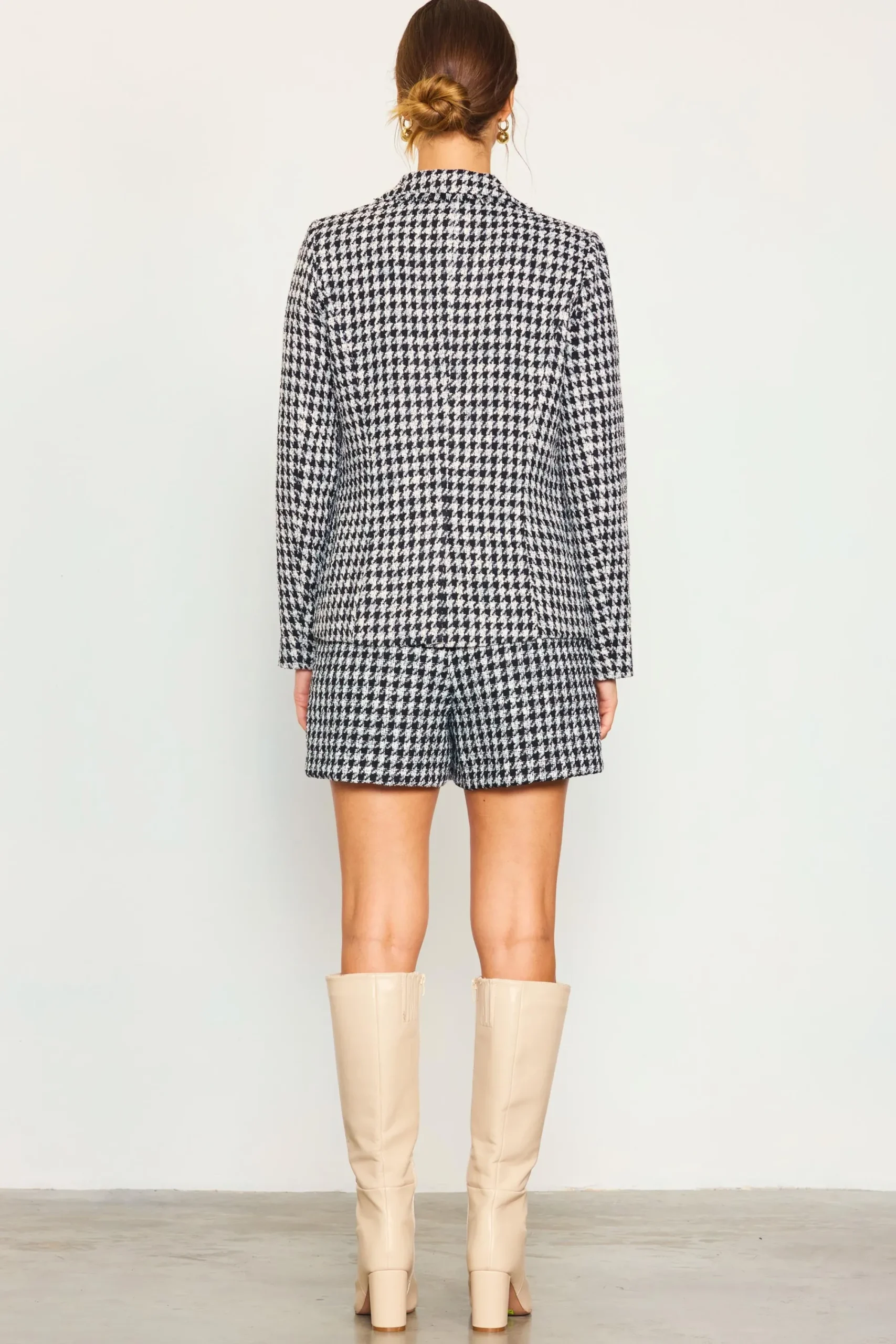 These shorts are tailored from a tweedy houndstooth fabric in black and cream. The pair sits high on the waist and has soft fringe at the hems.