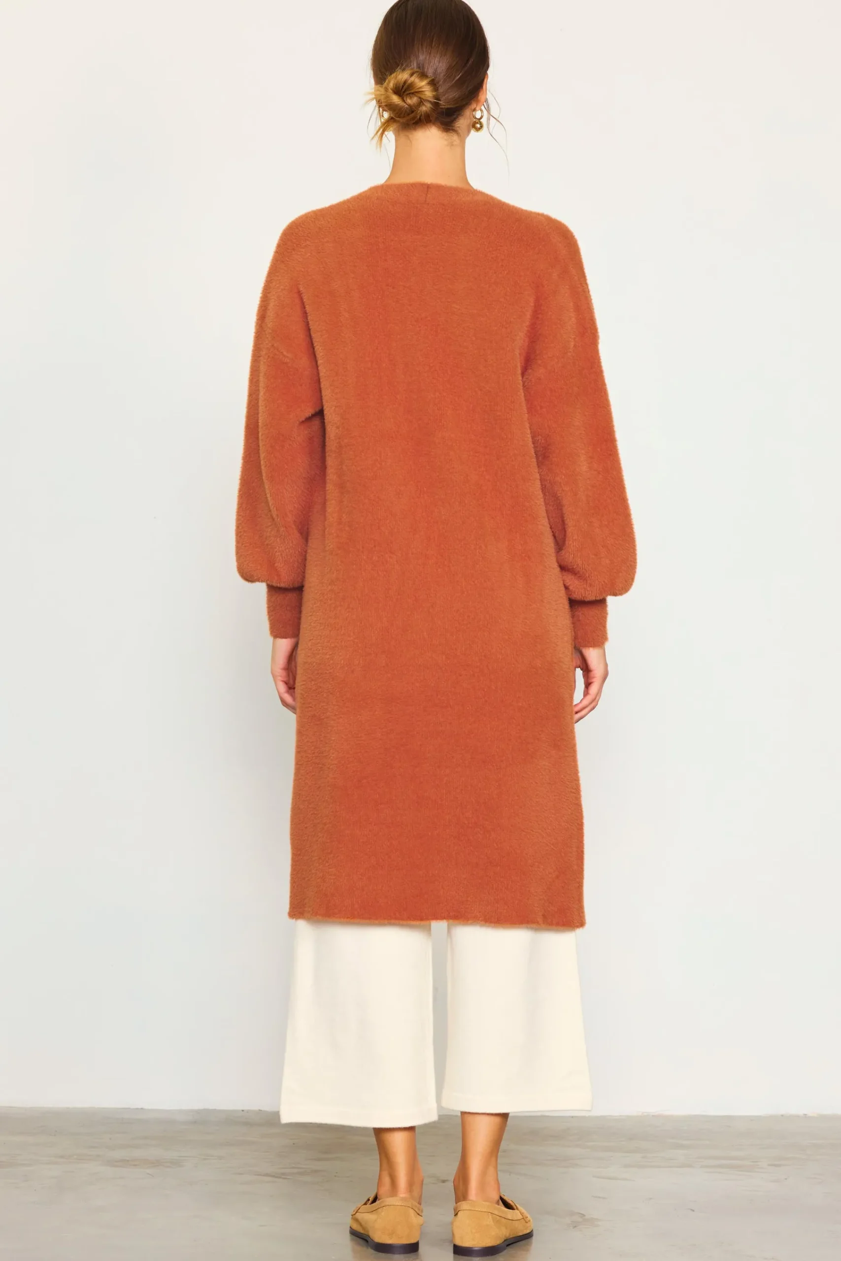 Part coat, part cardigan. With its soft, fuzzy texture in a long-line silhouette, you’ll want to layer this one over everything.