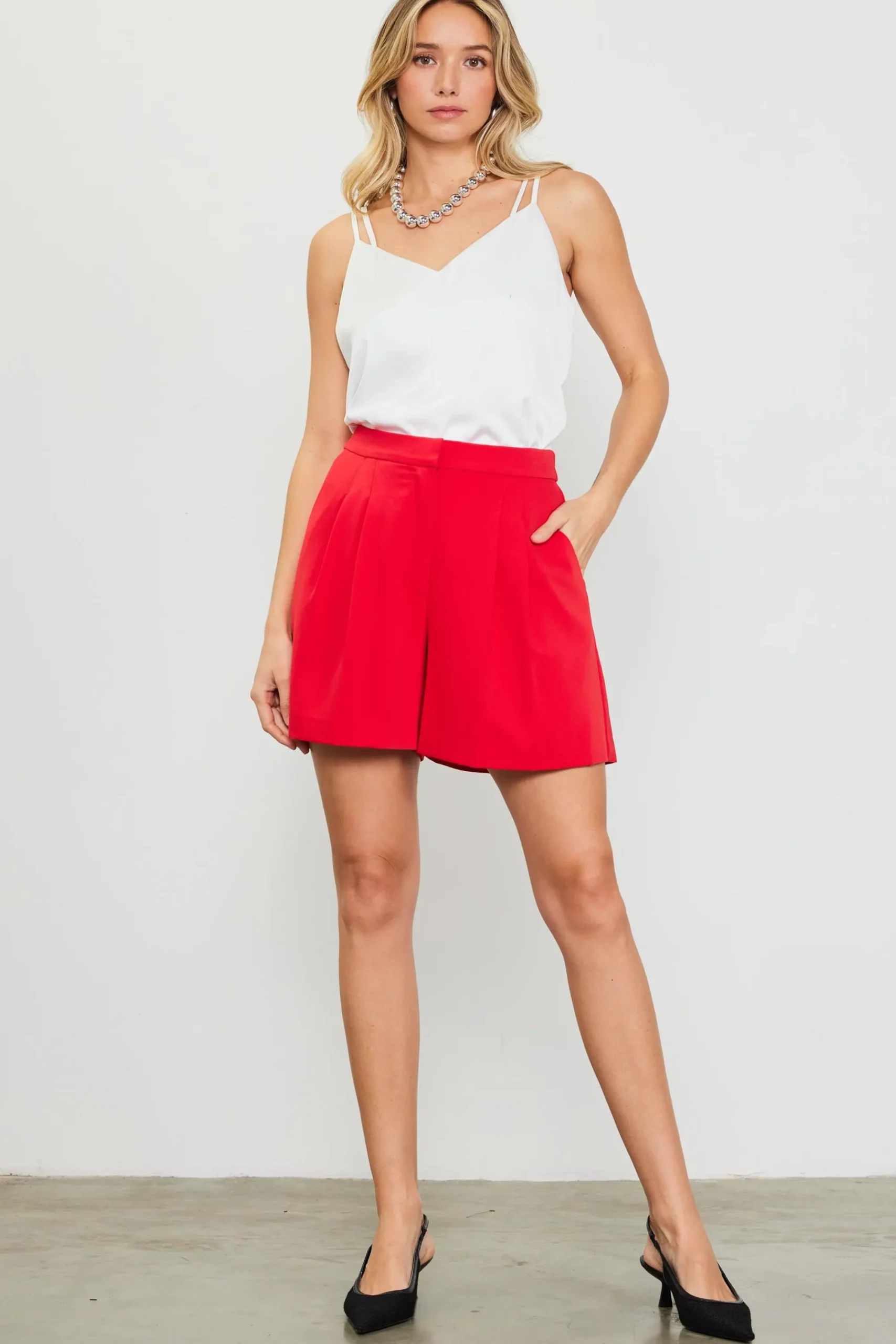 Simple and classic, these high-rise shorts have a clean front waistband and pleat detailing. They’re elasticized at the back waist, so you can move through the day in comfort. A natural companion piece to our sleeveless tailored blazer.