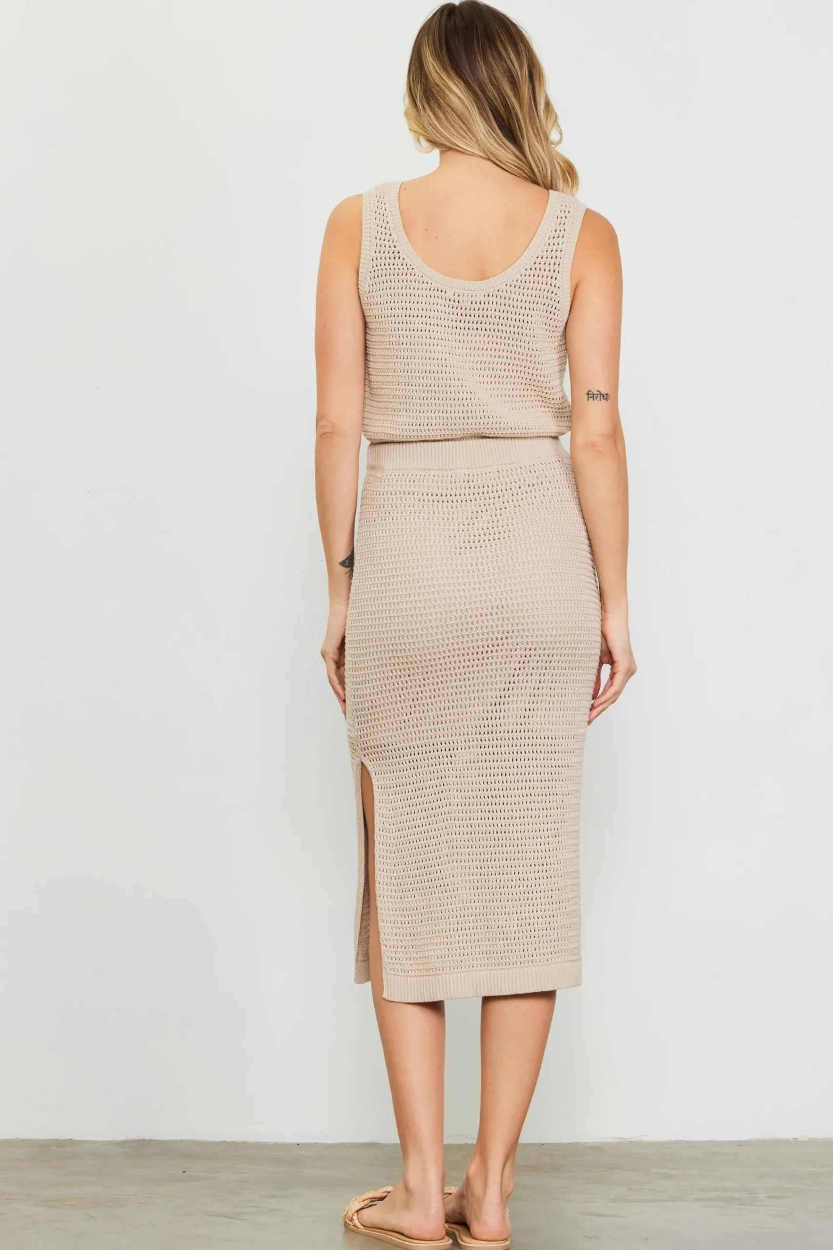 This midi skirt comes in a textural open knit that’s perfect for warm, sunny days. It’s comfortable and easy to slip on, designed to sit high on the waist and finished with deep side slits.