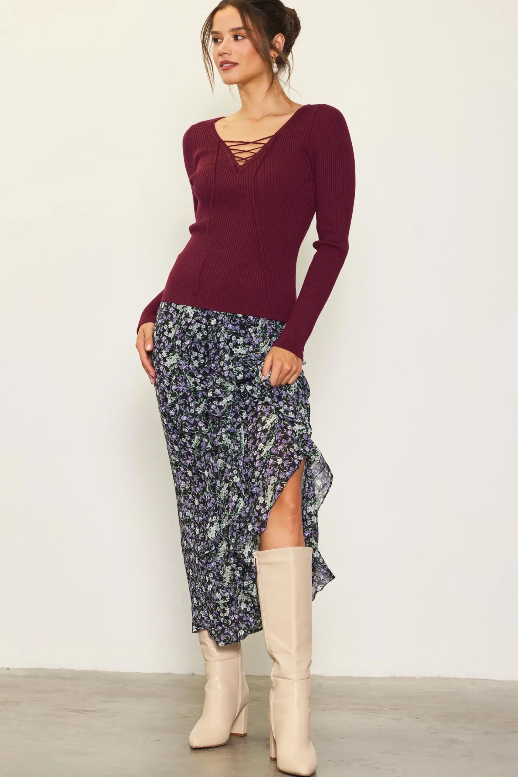 Made from a figure-hugging rib knit, this long-sleeve top has a plunging neckline with lace-up tie detailing that lets you adjust the coverage. Cozy, comfortable, and just the right amount of sexy.