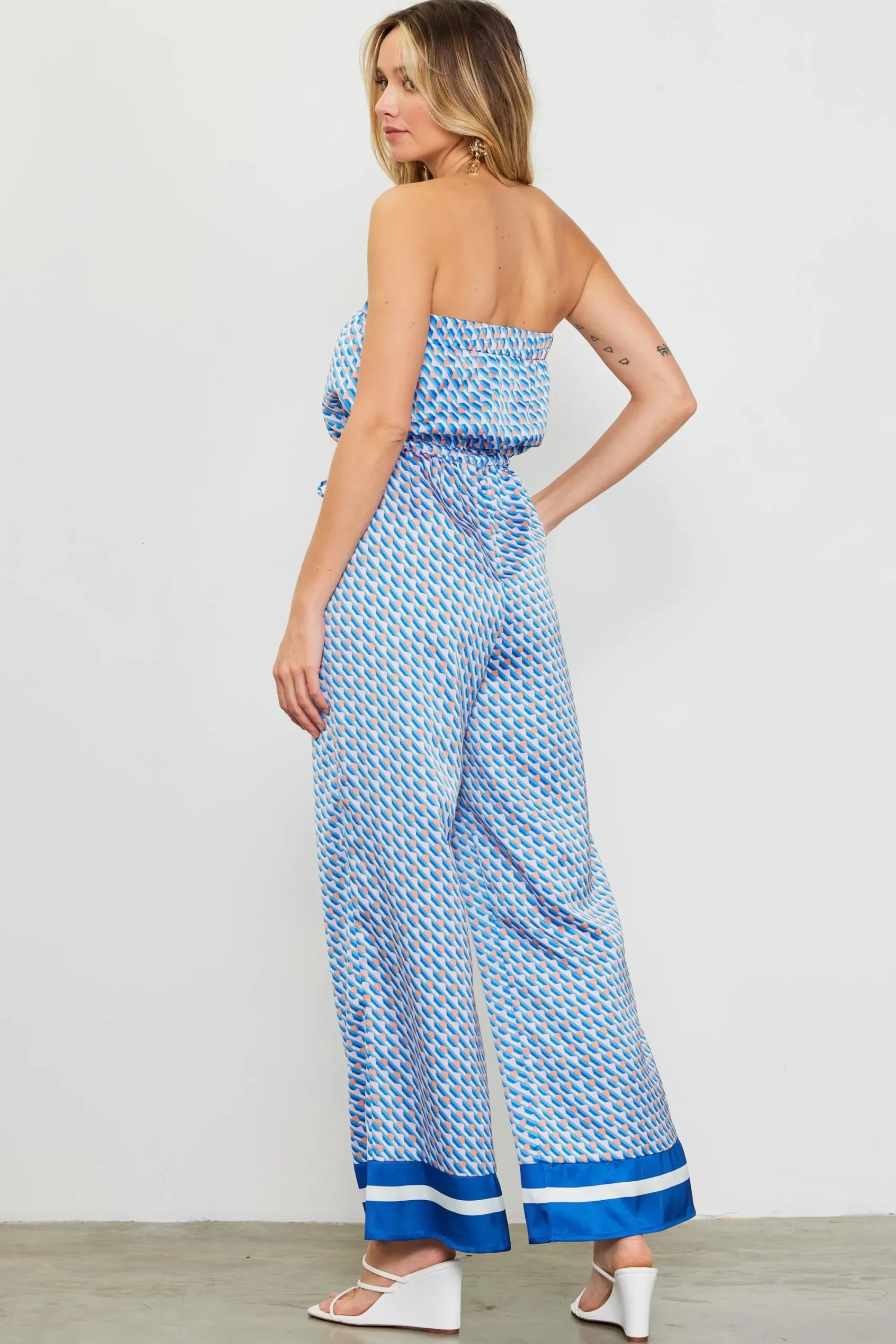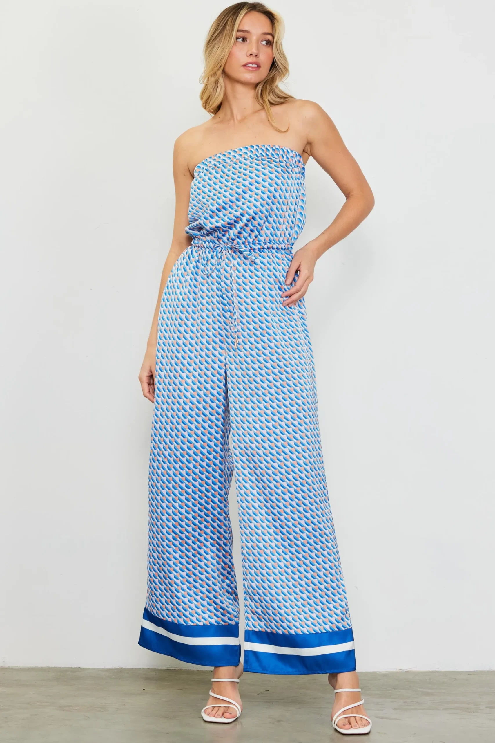 This strapless jumpsuit takes all the guesswork out of getting dressed. Decorated with a cool bandana print, it’s got a drawstring waist, hip pockets, and wide legs accented by bold stripes.