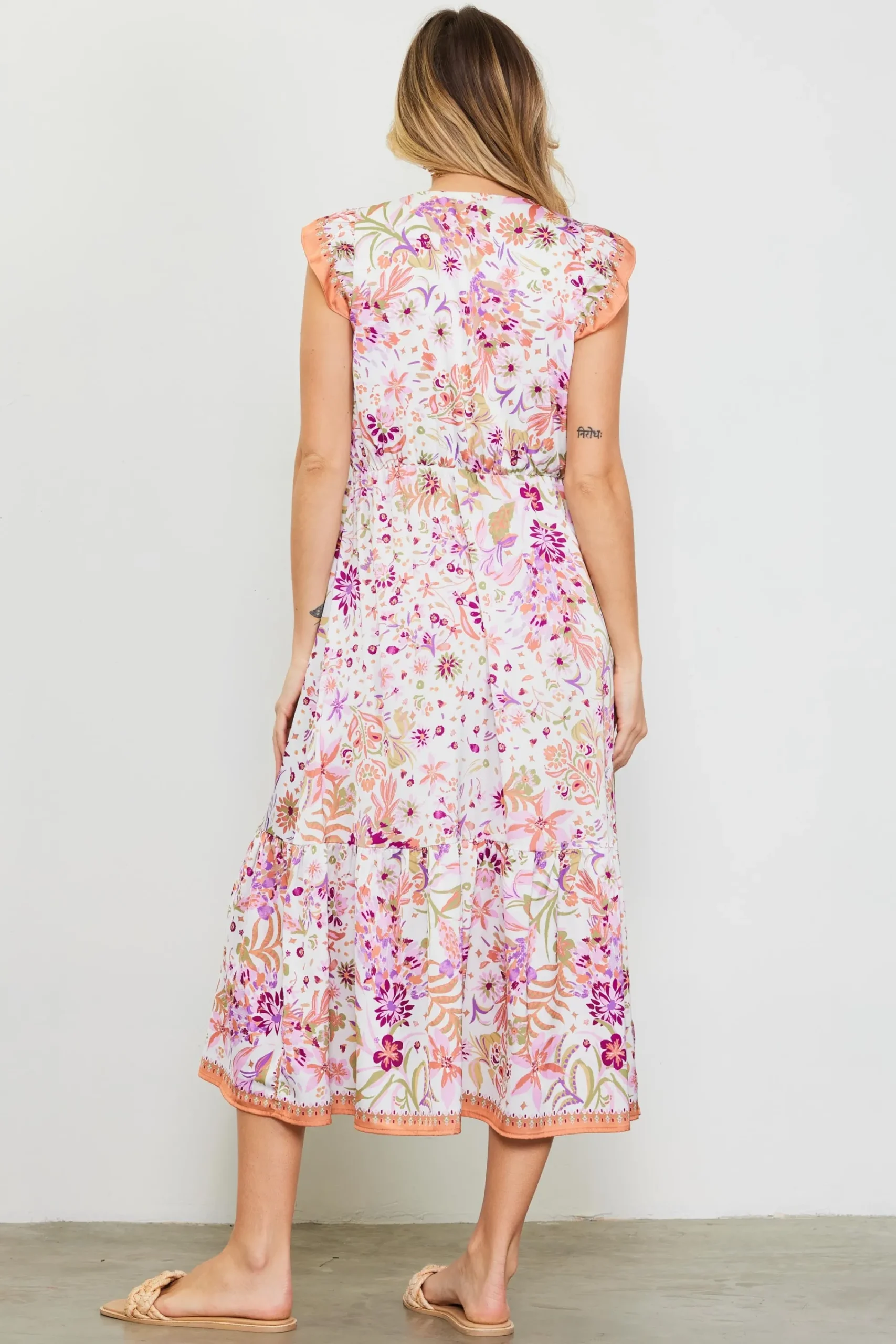 Ready to bloom. This floral midi dress has a flattering V-shaped neckline bodice, an elasticized empire waist, and dainty buttons at the front. A contrasting border print accents the fluttery short sleeves and ruffled hem, adding the perfect highlight to this feminine silhouette.