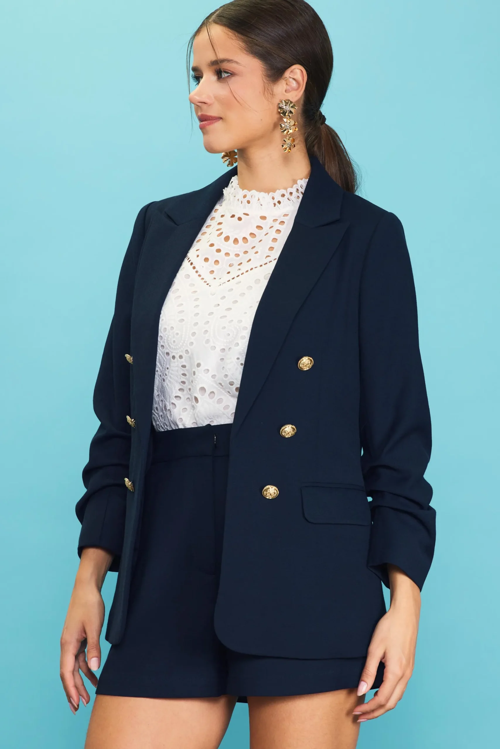 A navy blazer with a maritime vibe is a true classic that never goes out of style. This one’s updated with an open front placket, decorative silver-toned buttons, and shirred three-quarter sleeves. Wear it with the matching shorts, your favorite jeans, or white tailored pants.