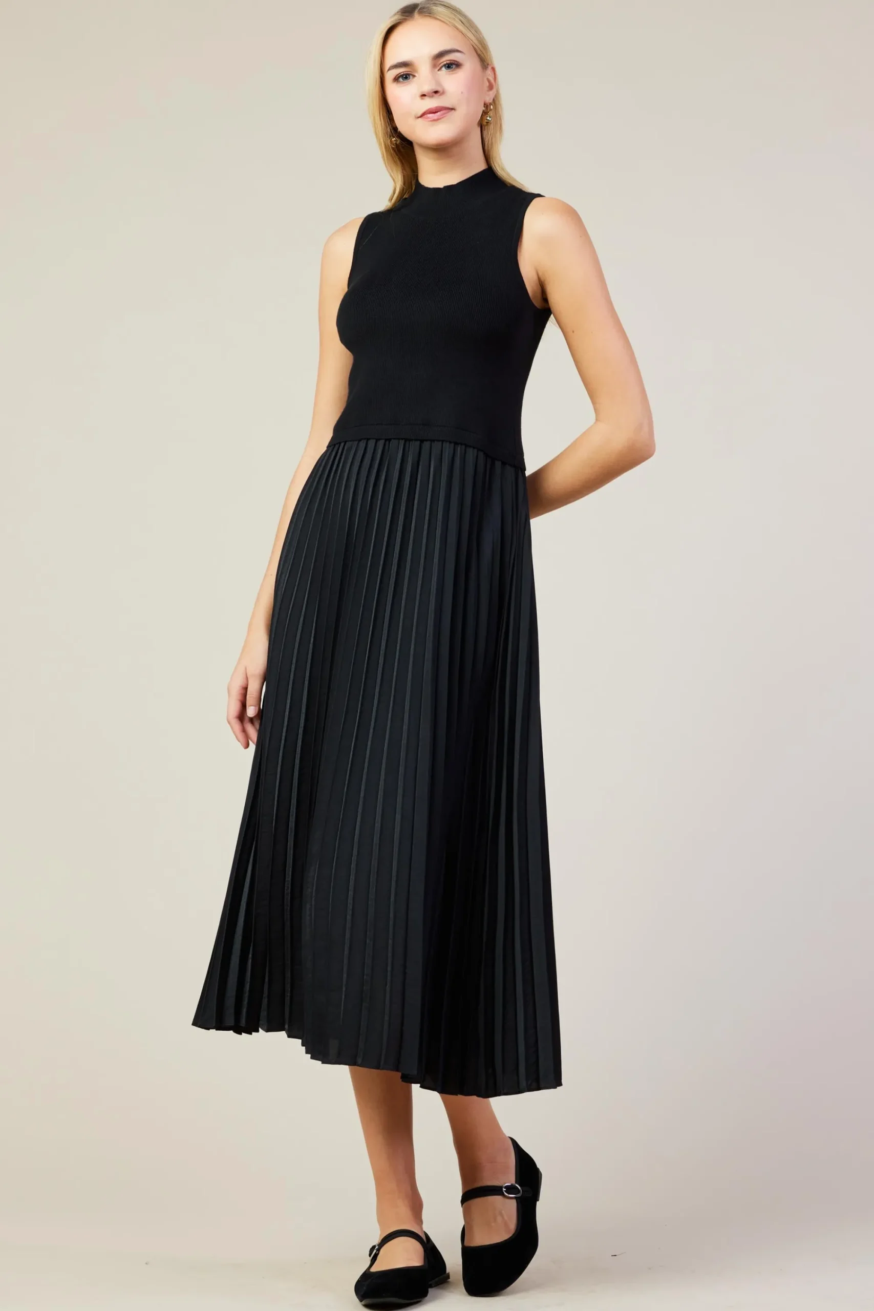 Chic and comfortable with lots of movement, this midi dress features a sleeveless mockneck bodice in a ribbed knit contrasted by a woven skirt with cascading pleats. An effortless piece to wear to work or out on the weekend.