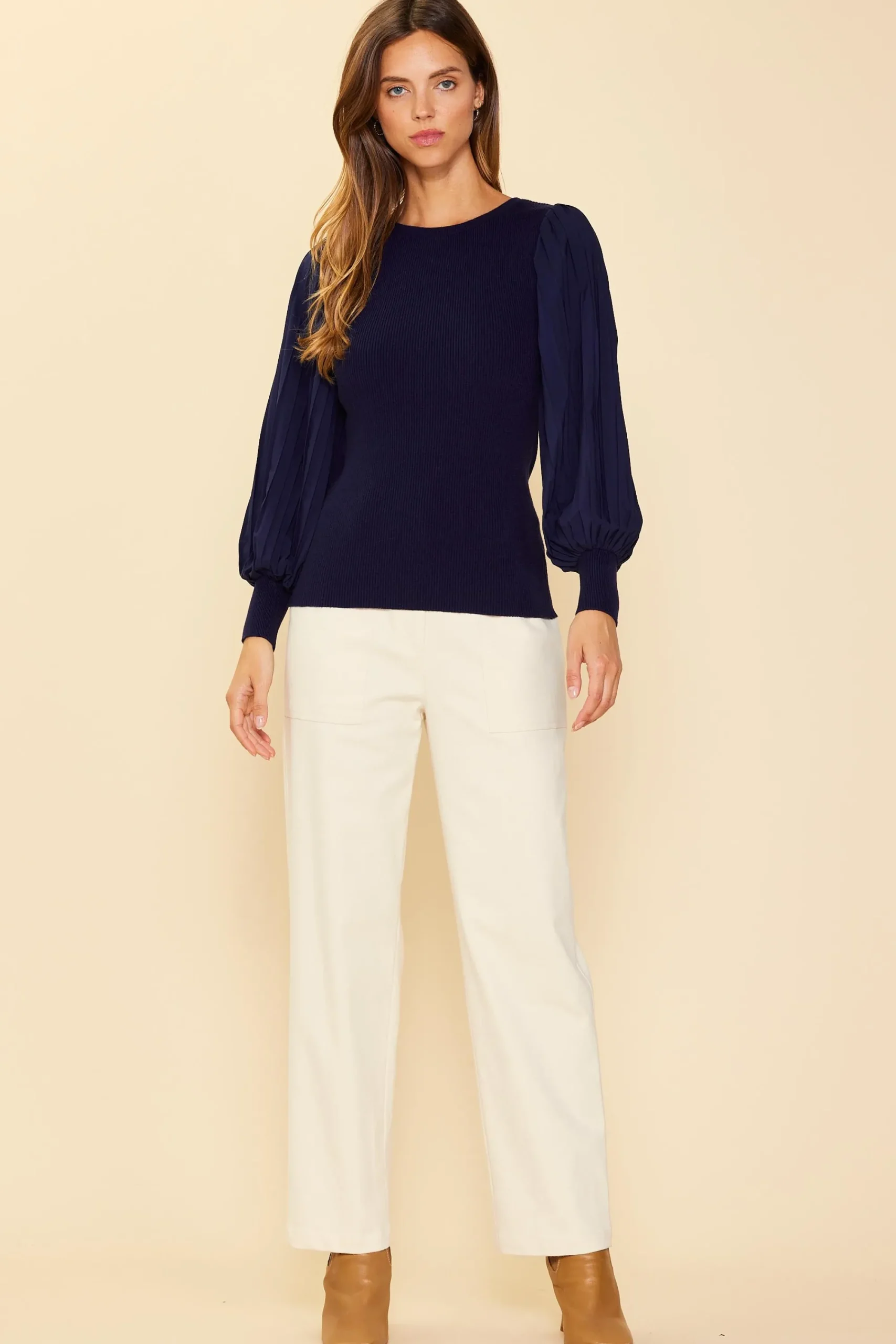 Made from a figure-hugging rib knit, this top has a round neckline and long, pleated sleeves in a lightweight woven fabric. Knit cuffs draw in the shape.