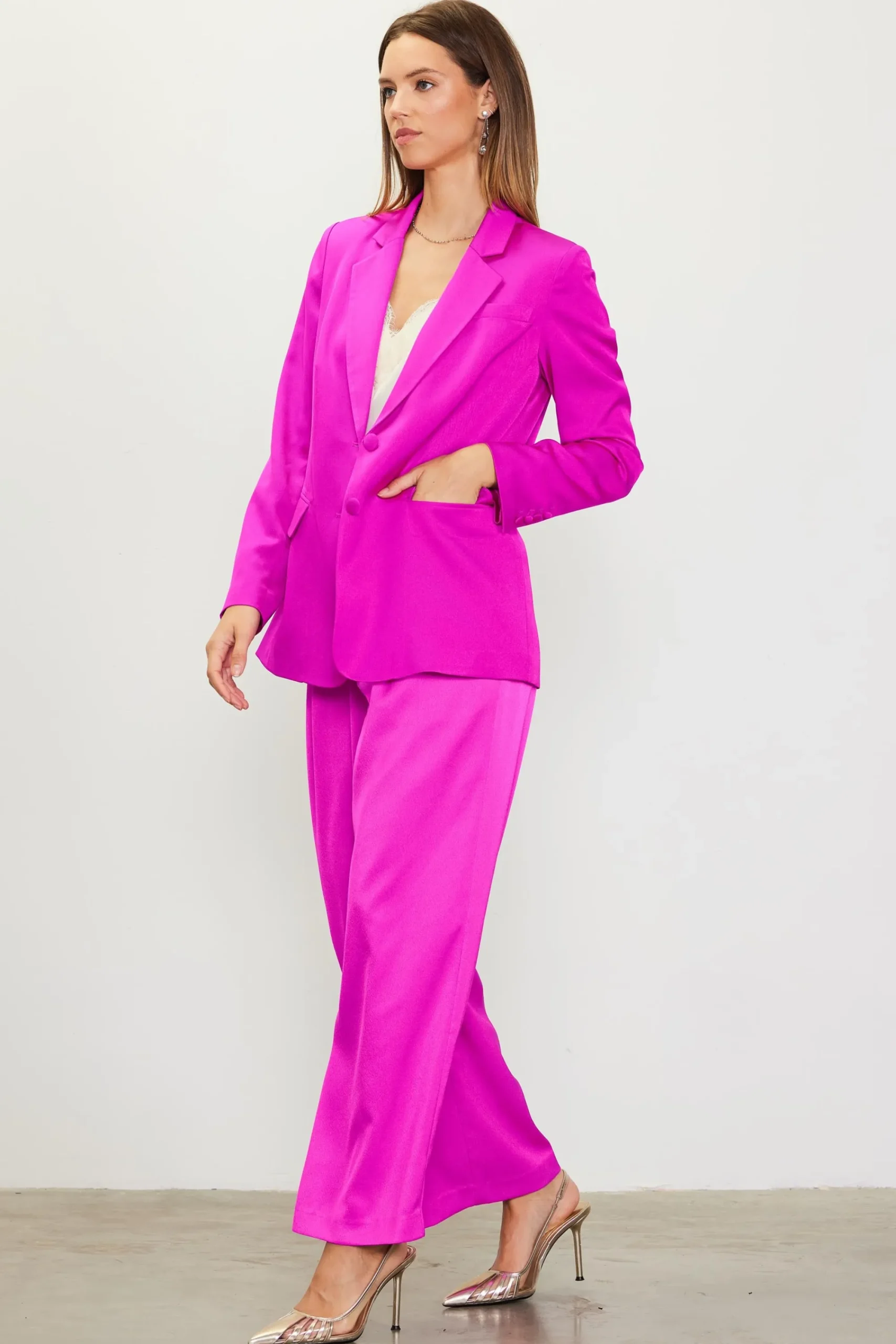 A bold take on tailored style. This welt-pocket blazer has a classic silhouette and timeless details, but the vibrant color makes it stand out. Amplify the effect by adding our matching pants.