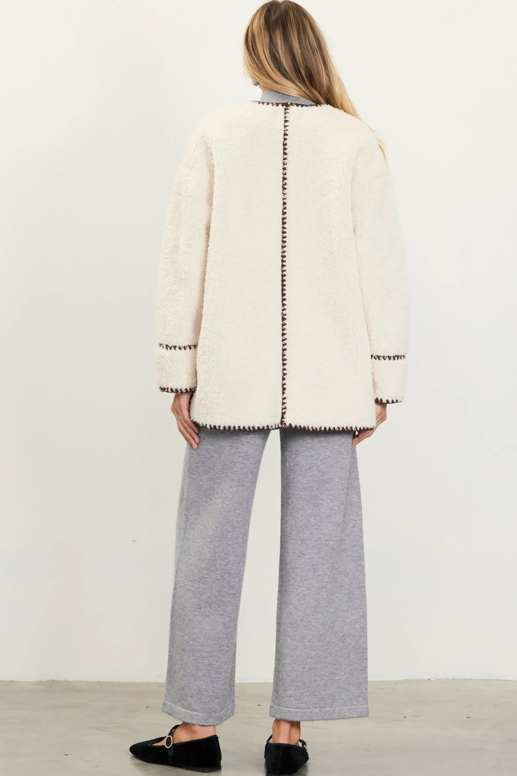 Wrap yourself in the clean lines and cozy comfort of this sherpa coat. Contrasted by blanket stitch detailing along the edges, it’s got a simple knee-length silhouette with a deep V-neckline, long sleeves, and a single patch pocket at one hip. Belt the waist to finish the look.