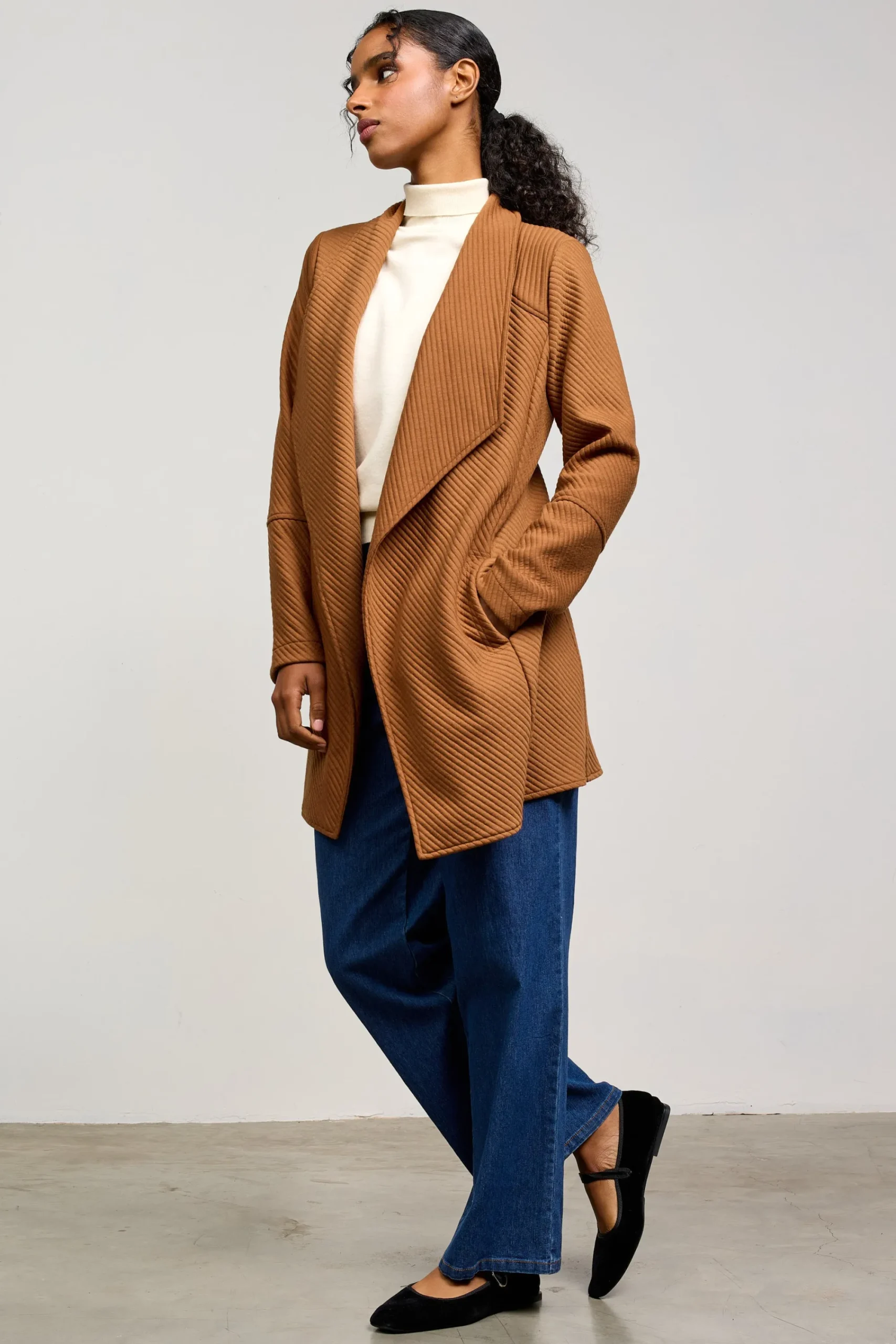 Throw on this open-front cardigan at the slightest hint of chill. Made from a quilted knit, it’s got longer lines, paneled sleeves, and an exaggerated collar for a modern statement.