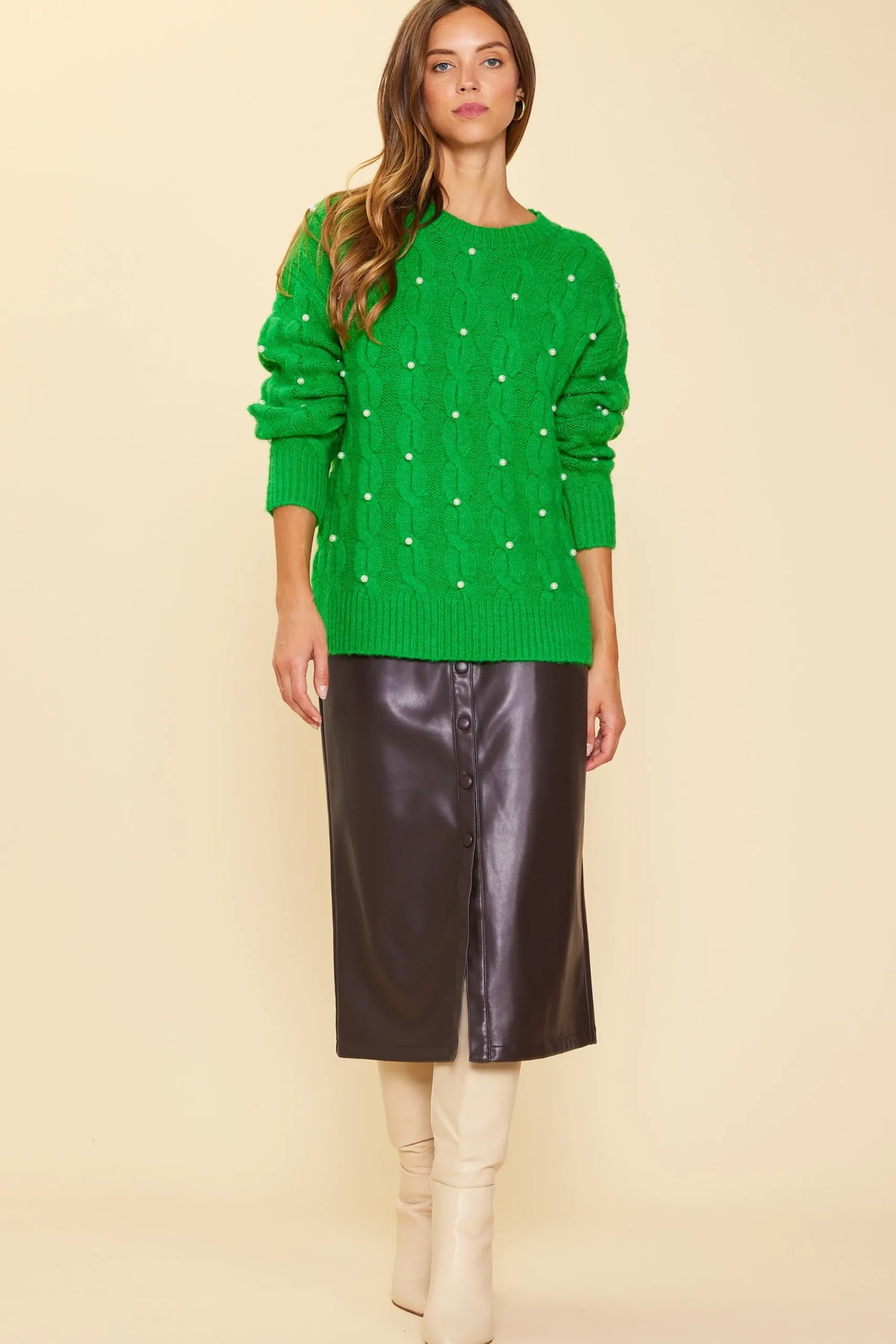 Faux-pearl embellishments dot the cable-knit design of this cozy pullover sweater. It’s a whimsical way to dress up a pair of jeans or pair with a slinky skirt.