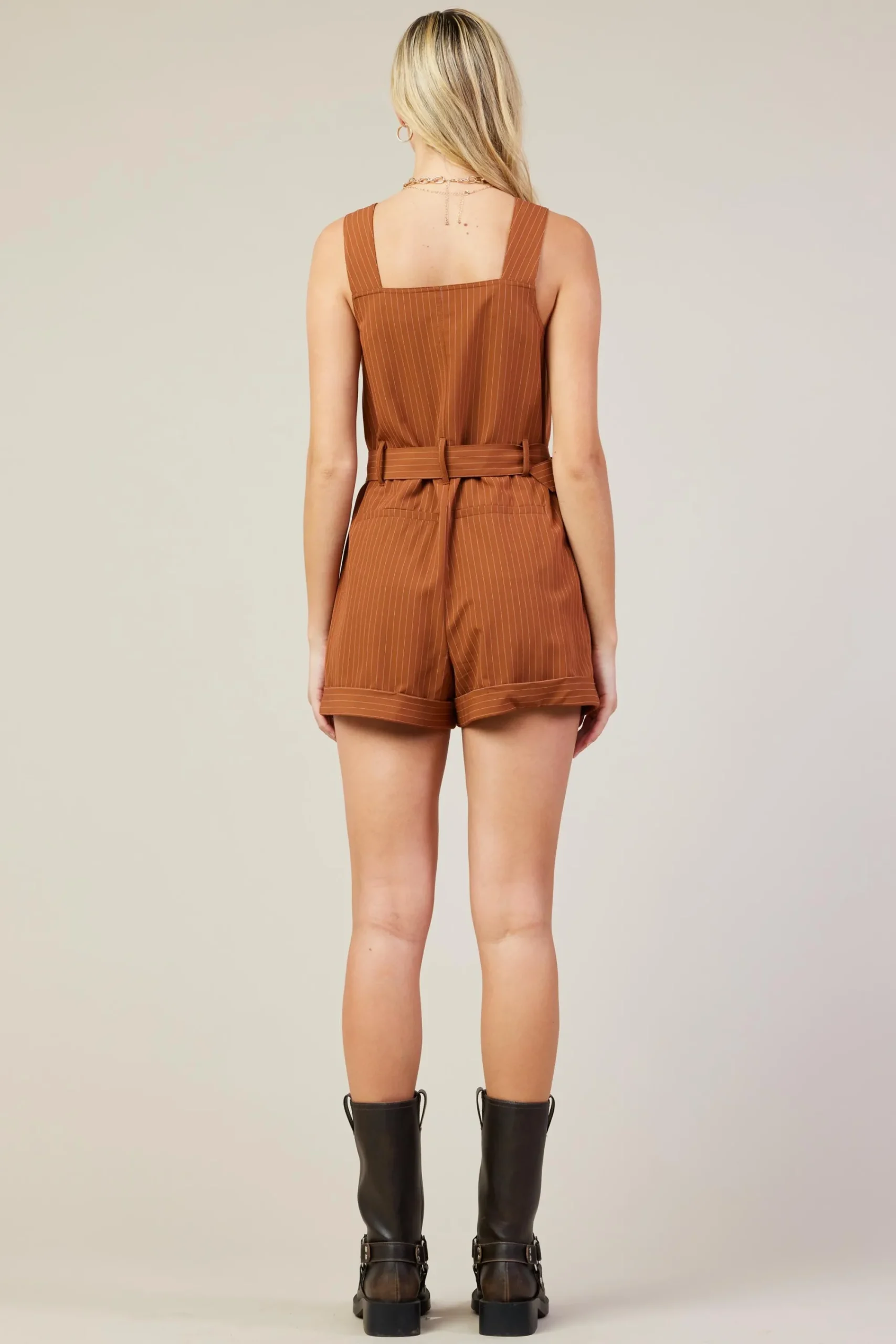 Get in line. This buttondown romper offers a summer-ready take on pinstripes. It’s got wide shoulder straps, pleating at the front, and tidy cuffed hems—plus a matching belt to finish.