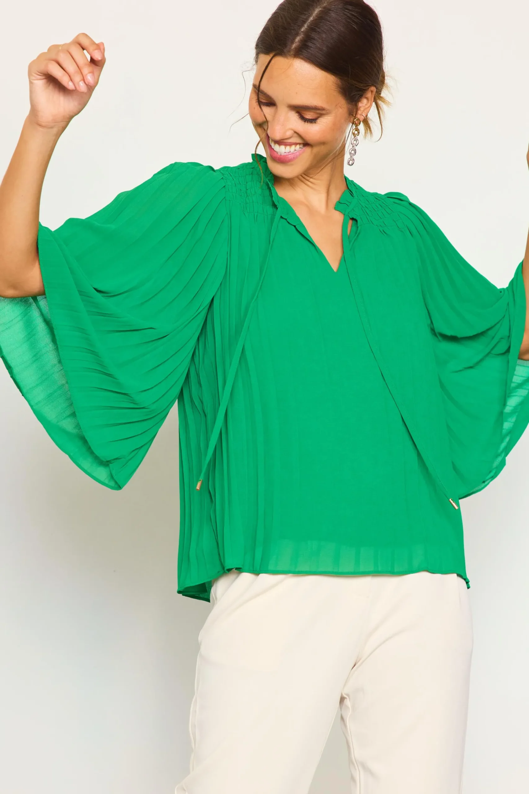 An eye-catching color and breezy pleats combine to create a bright point in your wardrobe. This split-neck top has a relaxed fit and long, flowy sleeves, accented by ruffle trim and a touch of smocking at the shoulders.