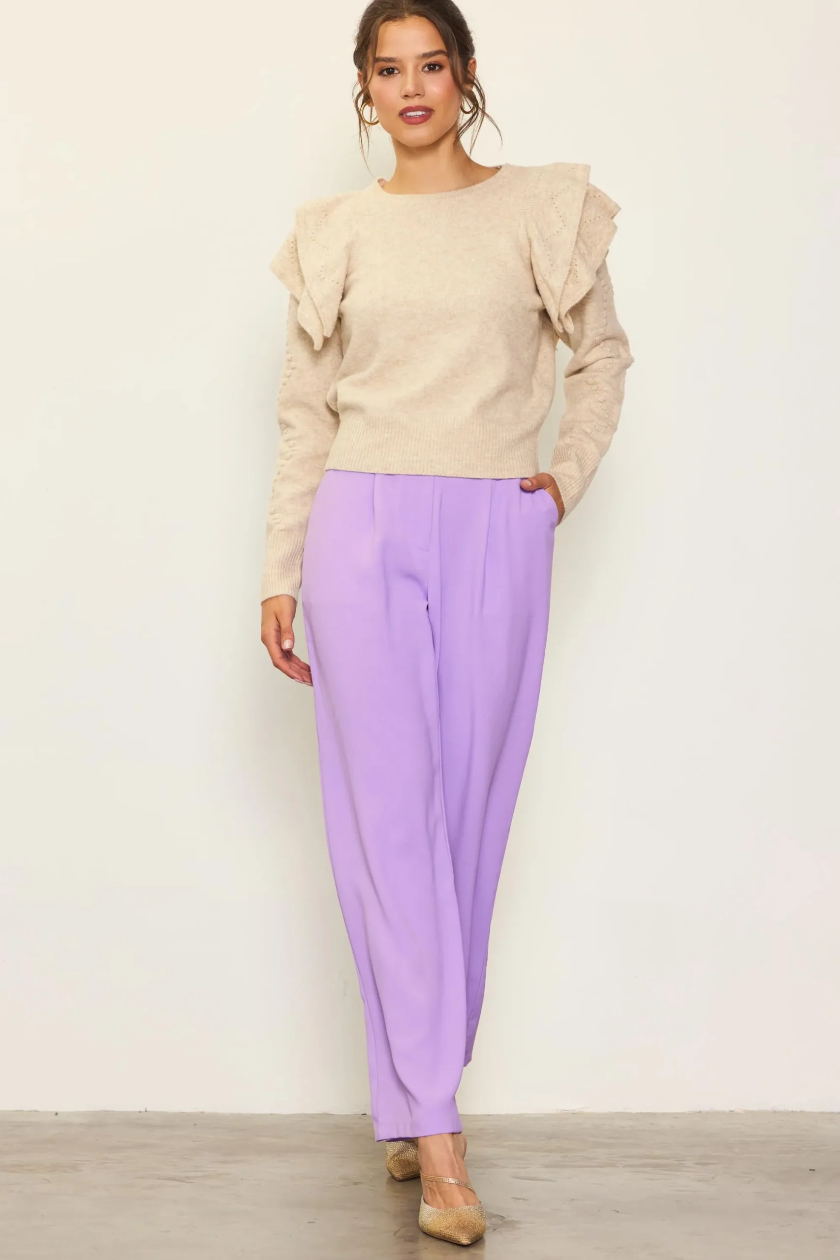 Pointelle-knit ruffles flutter at the shoulders of this cozy sweater with long, texture-rich sleeves. It’s a fun, feminine addition to your knitwear collection.