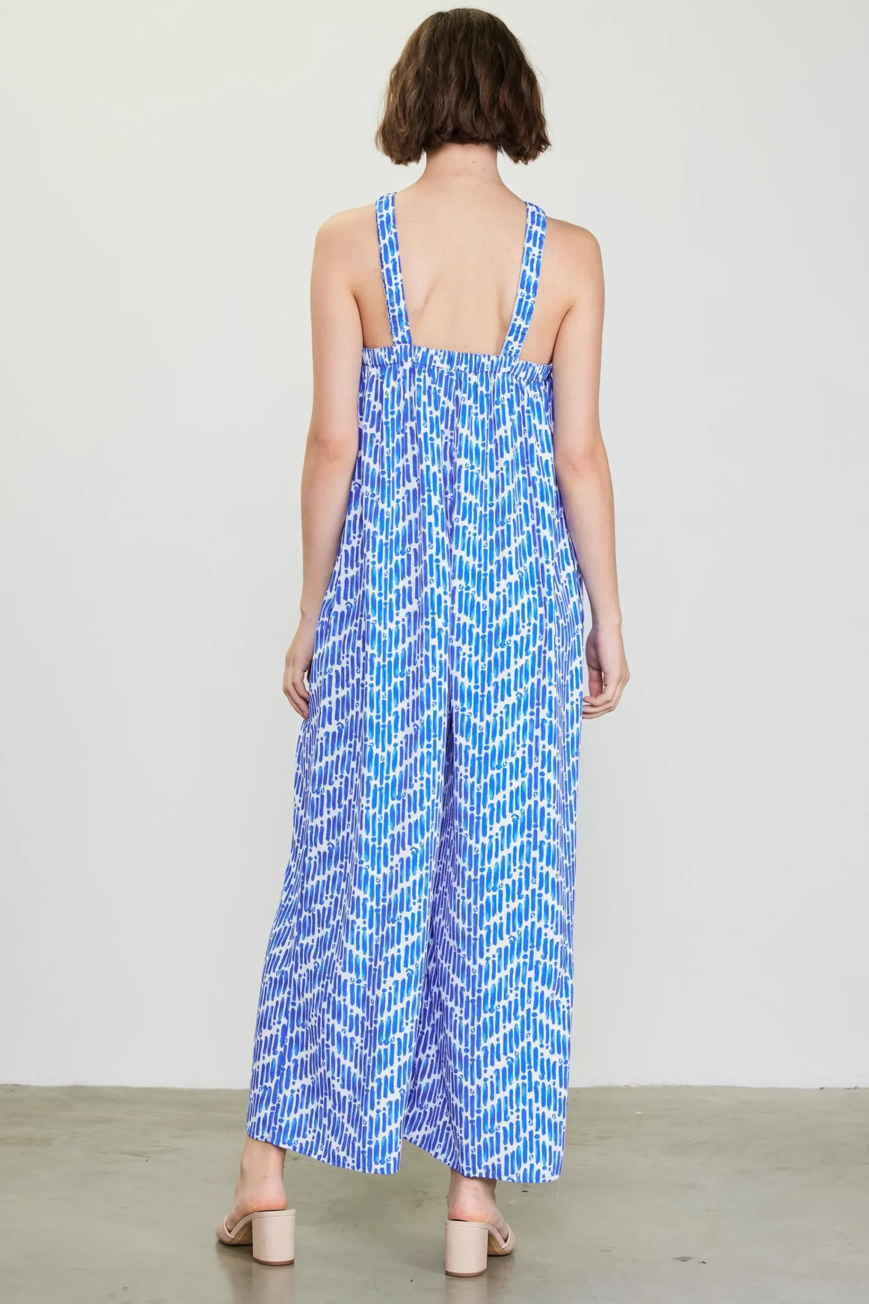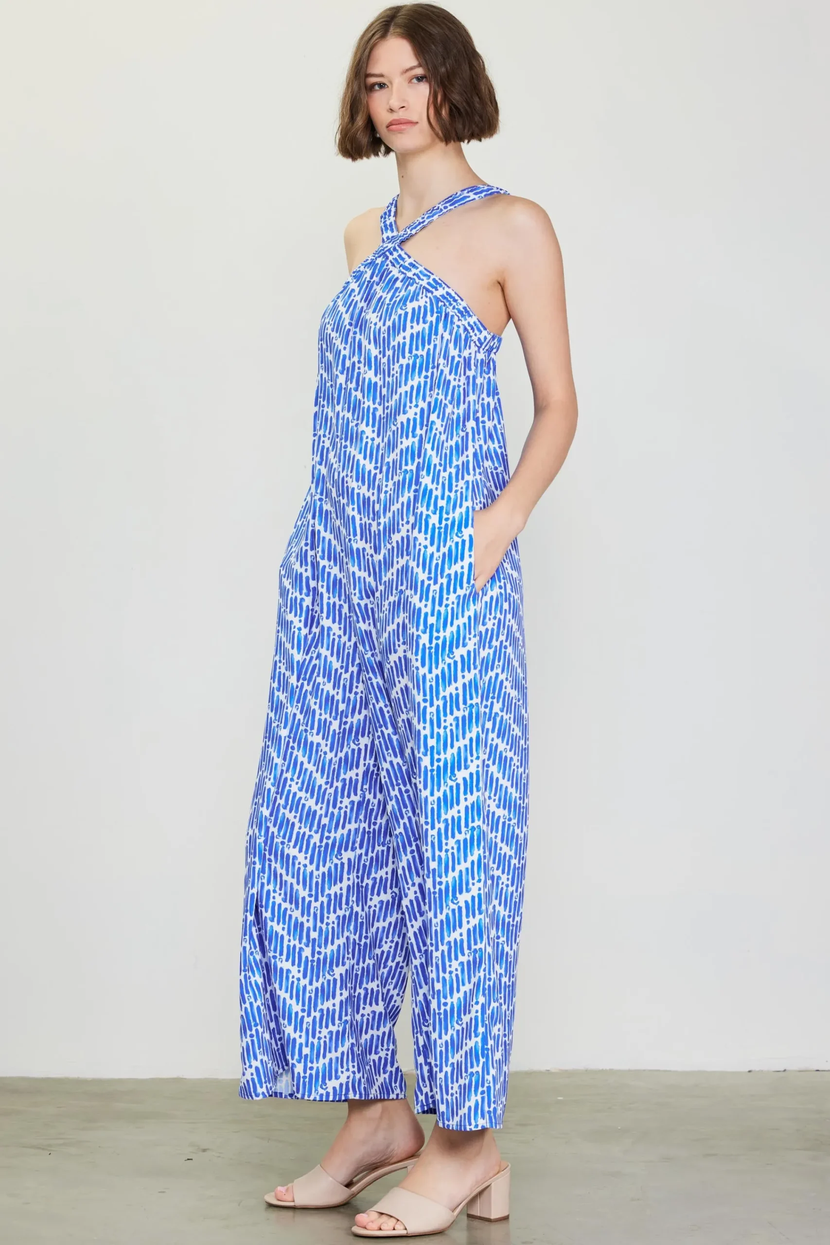 This halter jumpsuit has an air of easy glamour in a pleated wide-leg silhouette. Printed with a refreshing blue and white motif, the style floats on air and moves beautifully.