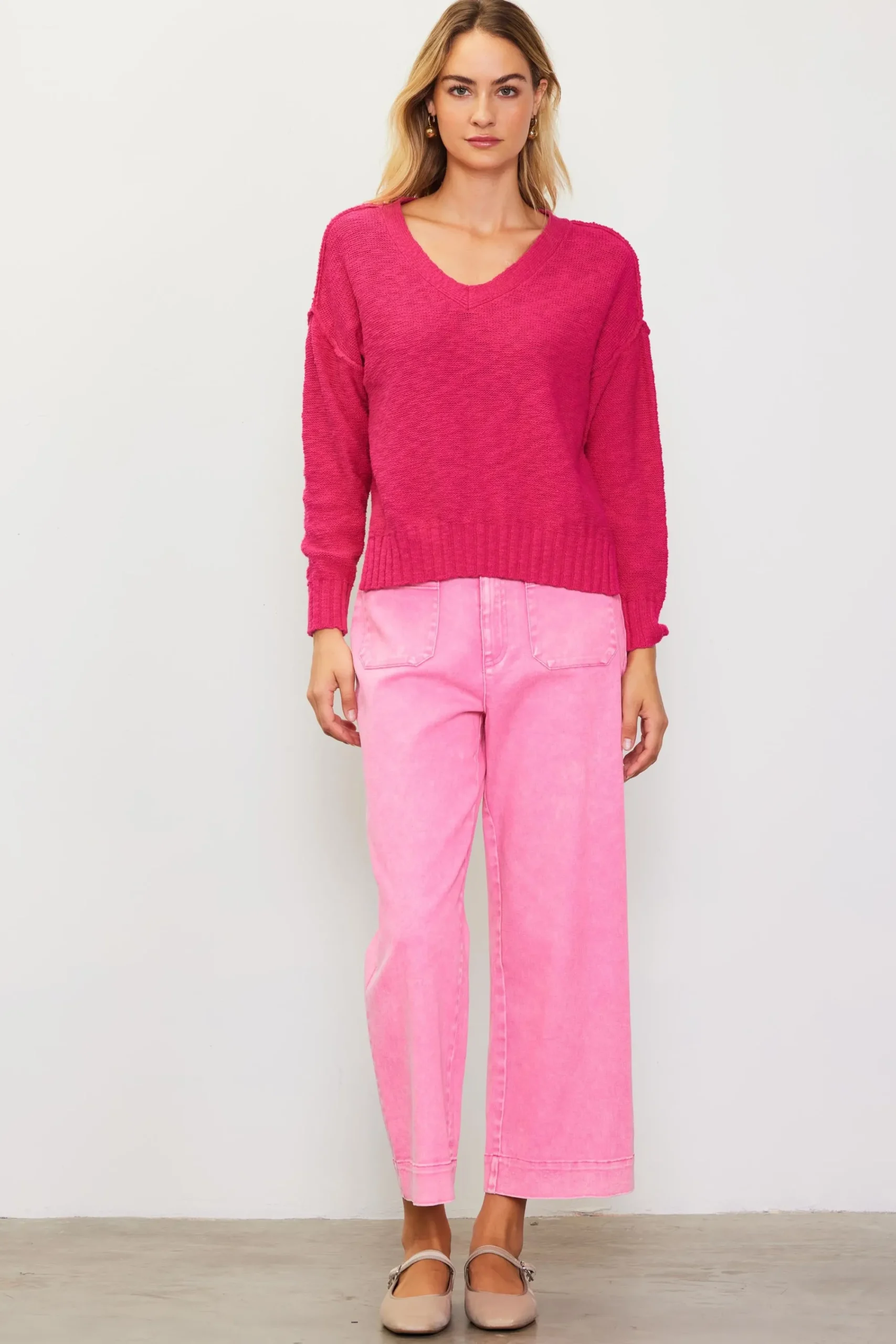 Designed for a slouchy fit, this V-neck sweater has dropped shoulders with exposed seam detailing. Chunky rib stitching at the cuffs and hem complete the cozy design.