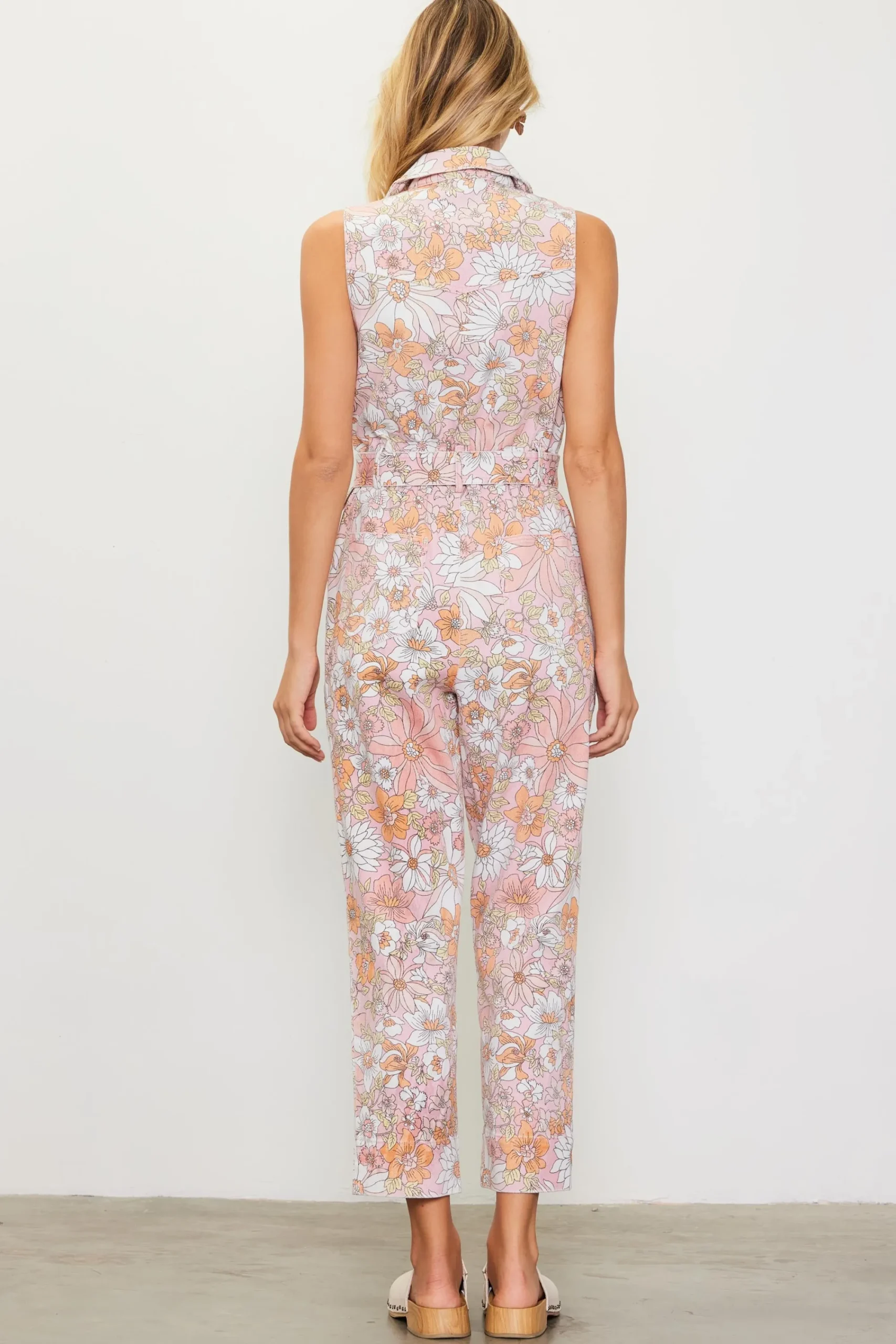 A fun play on one-and-done outfitting. This sleeveless twill jumpsuit is printed with a retro-inspired floral motif in a pastel color palette. Cut with slightly flared hems, it zips up at the front and features a notched collar, patch pockets, and a buckle belt to define the waist.
