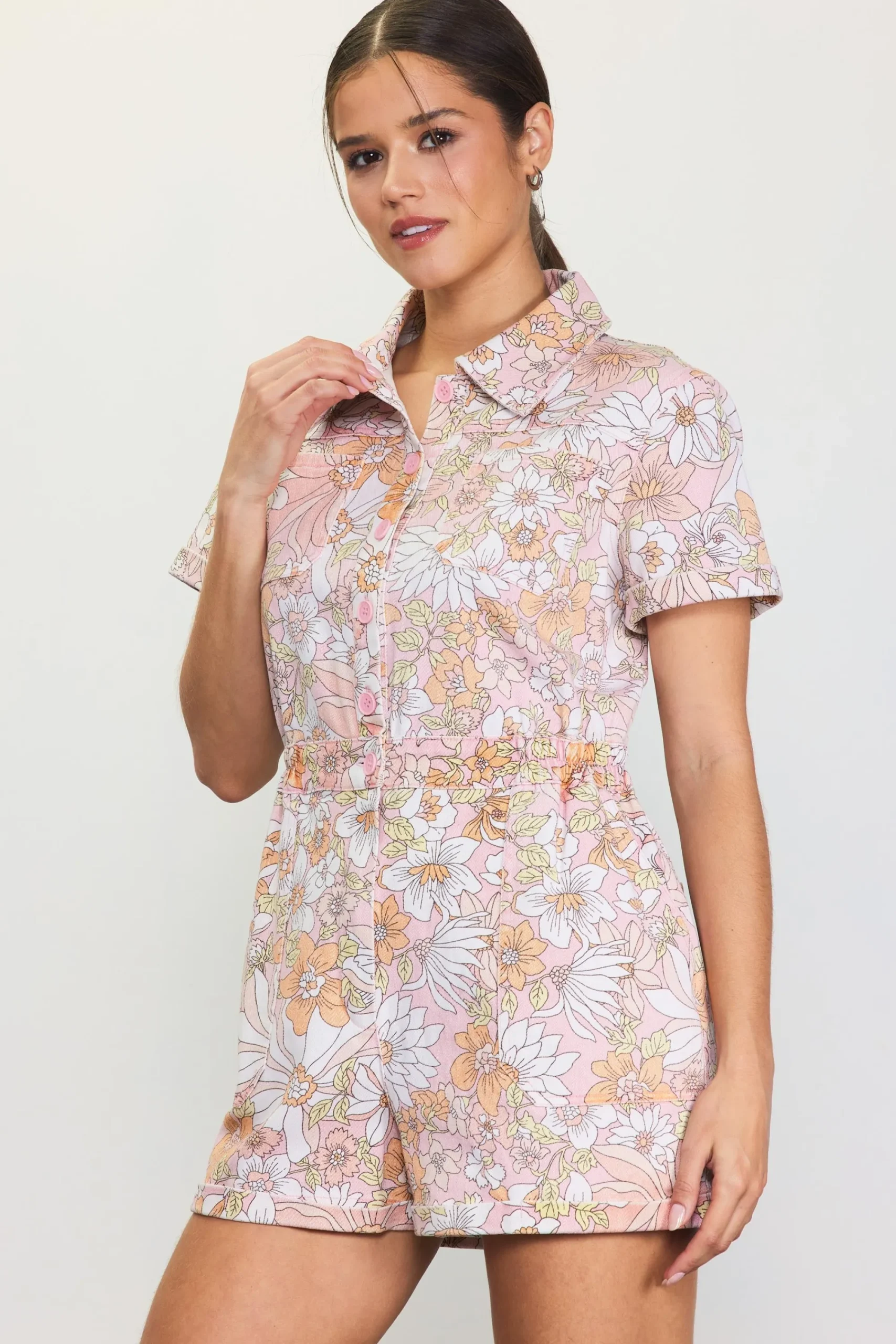 A playful take on effortless dressing, this short-sleeve twill romper showcases a retro-inspired floral print in a pastel color palette. It buttons at the front and features a pointed collar, patch pockets, and an elasticized waist to define the shape.
