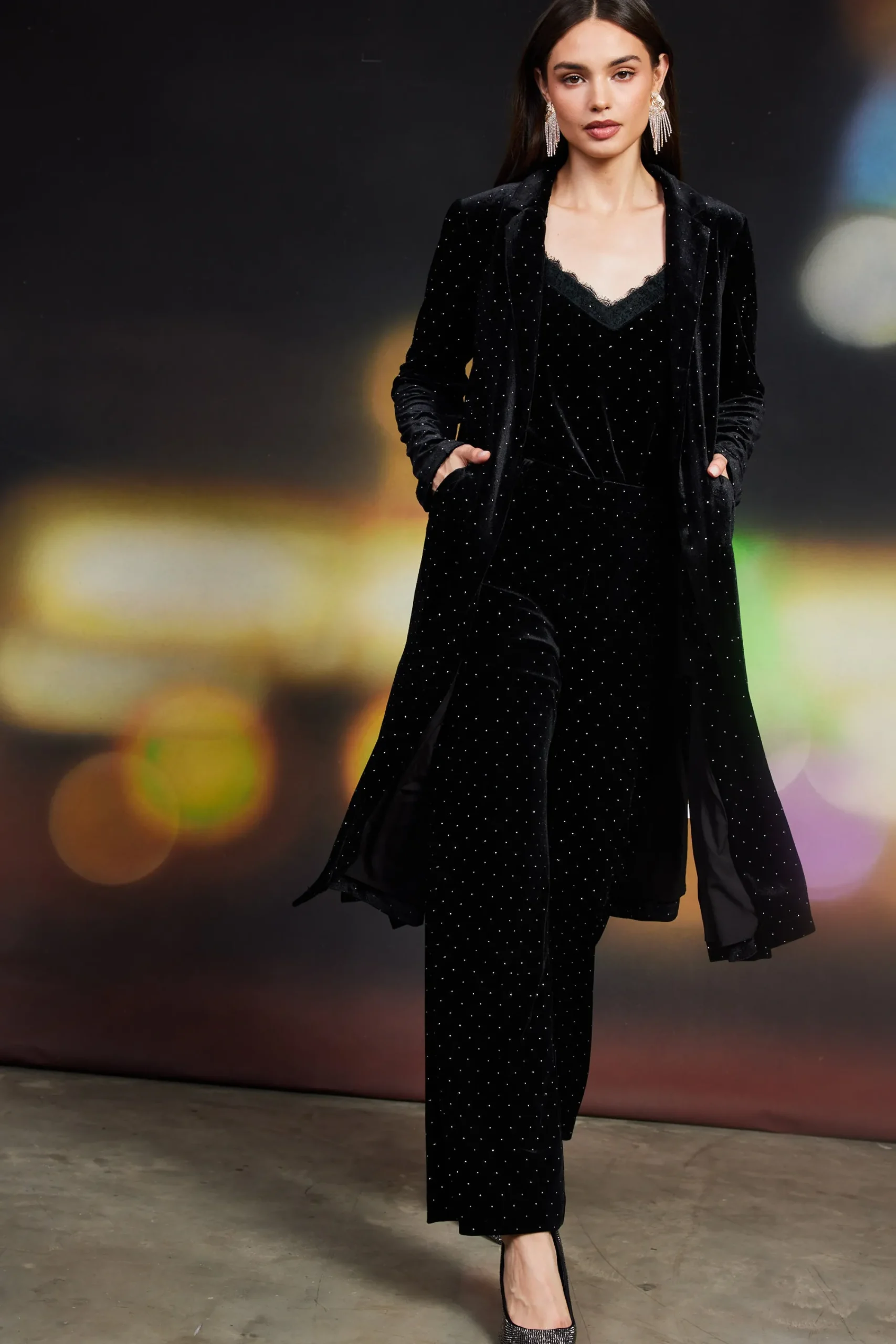 Velvet pants are already a great option for the season’s upcoming parties, but glimmering rhinestones really turn it up a notch. Sitting high on the waist, the pair falls straight through the legs and finishes with flared hems.