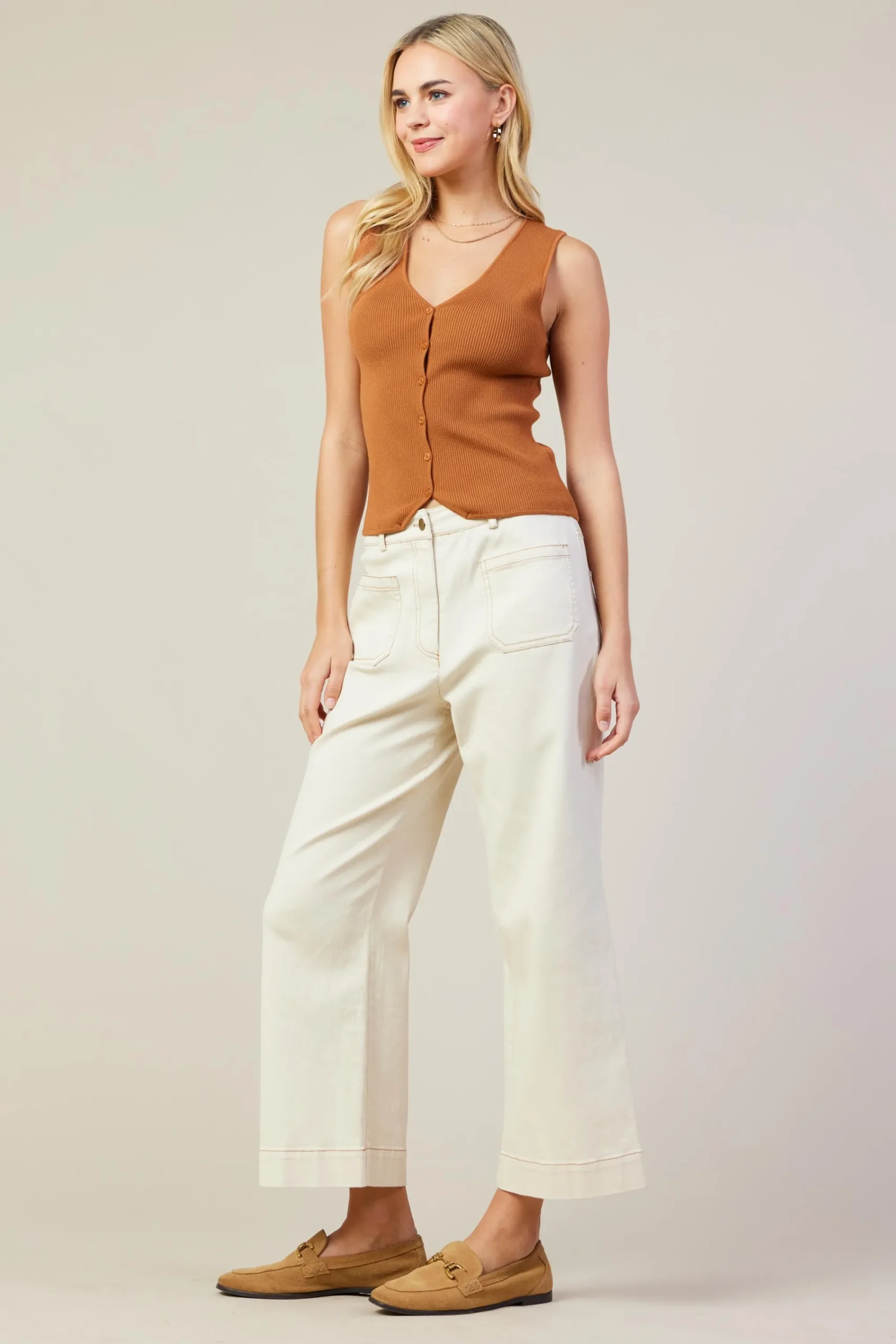 Cut from a clingy ribbed knit, this tank vest is flattering, comfortable, and easy to wear. It’s got a fitted silhouette with a plunging V-shaped neckline and petite buttons at the front.