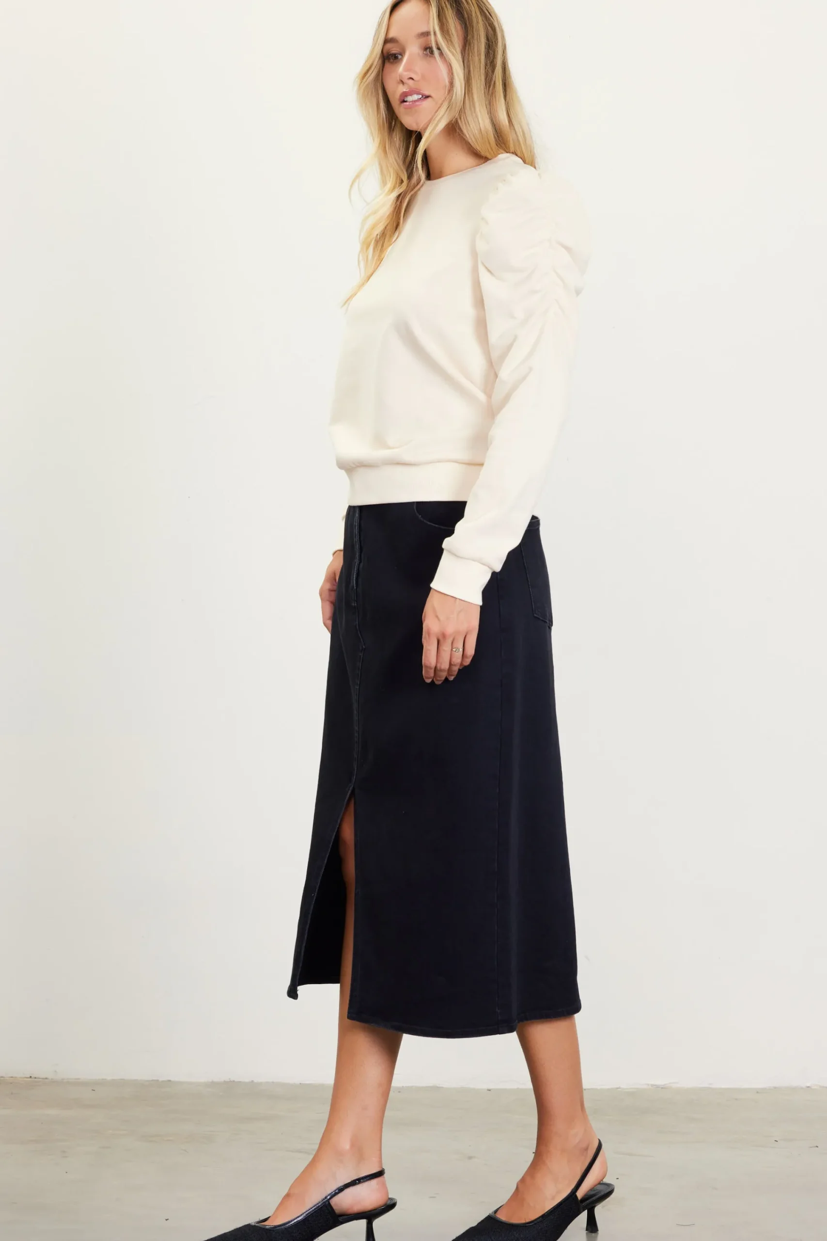 Voluminous ruched sleeves deliver a feminine take on the classic crewneck sweatshirt. Finished with ribbed trim, the style pulls on and wears comfortably.