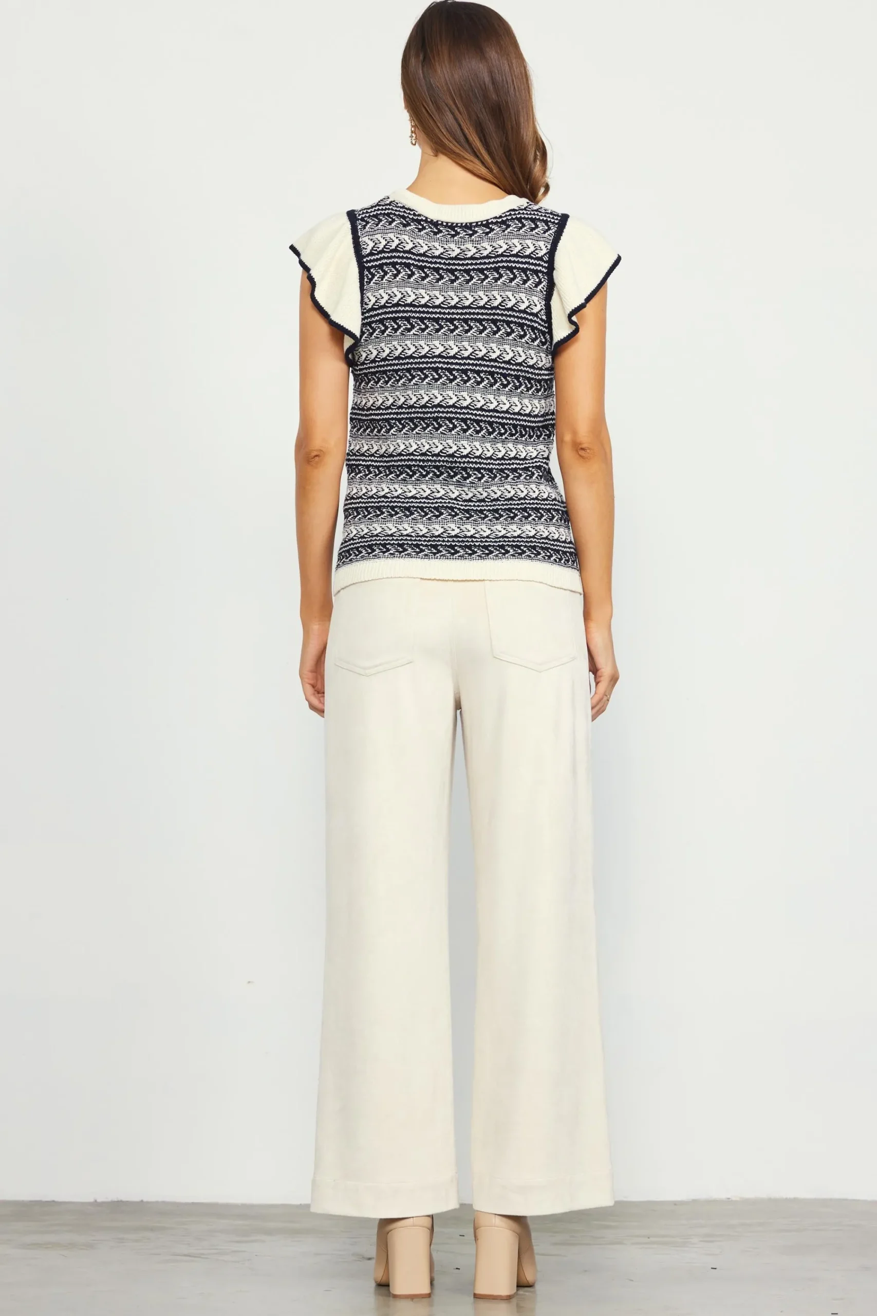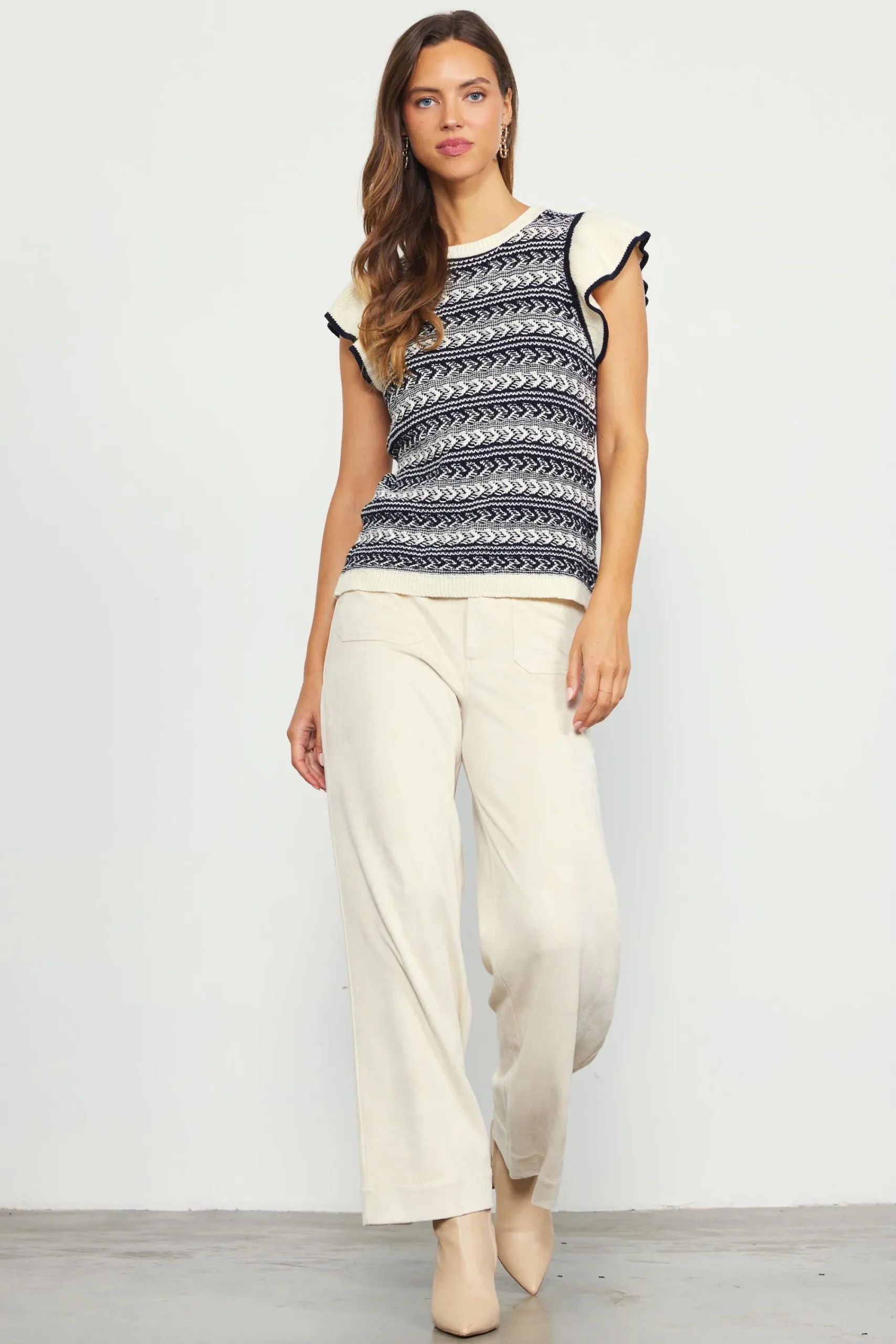 This summer-ready sweater has lots of texture thanks to a mix of stitches throughout. It’s designed with a round neckline and short, ruffled sleeves, plus a rolled hem for a slightly relaxed finish. The perfect knit top for warmer months.