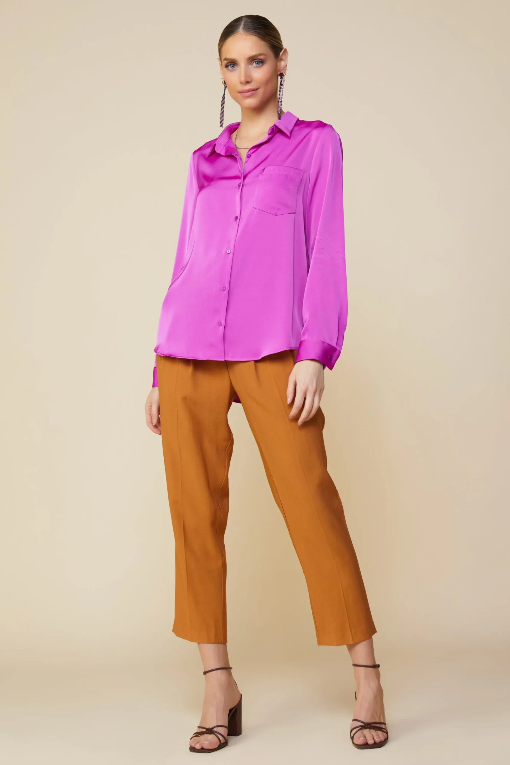 This satin buttondown shirt is one of those classics that will never steer you wrong. It’s got a pointed collar and a patch pocket, plus long sleeves with button tabs so you can roll them up and keep them in place.
