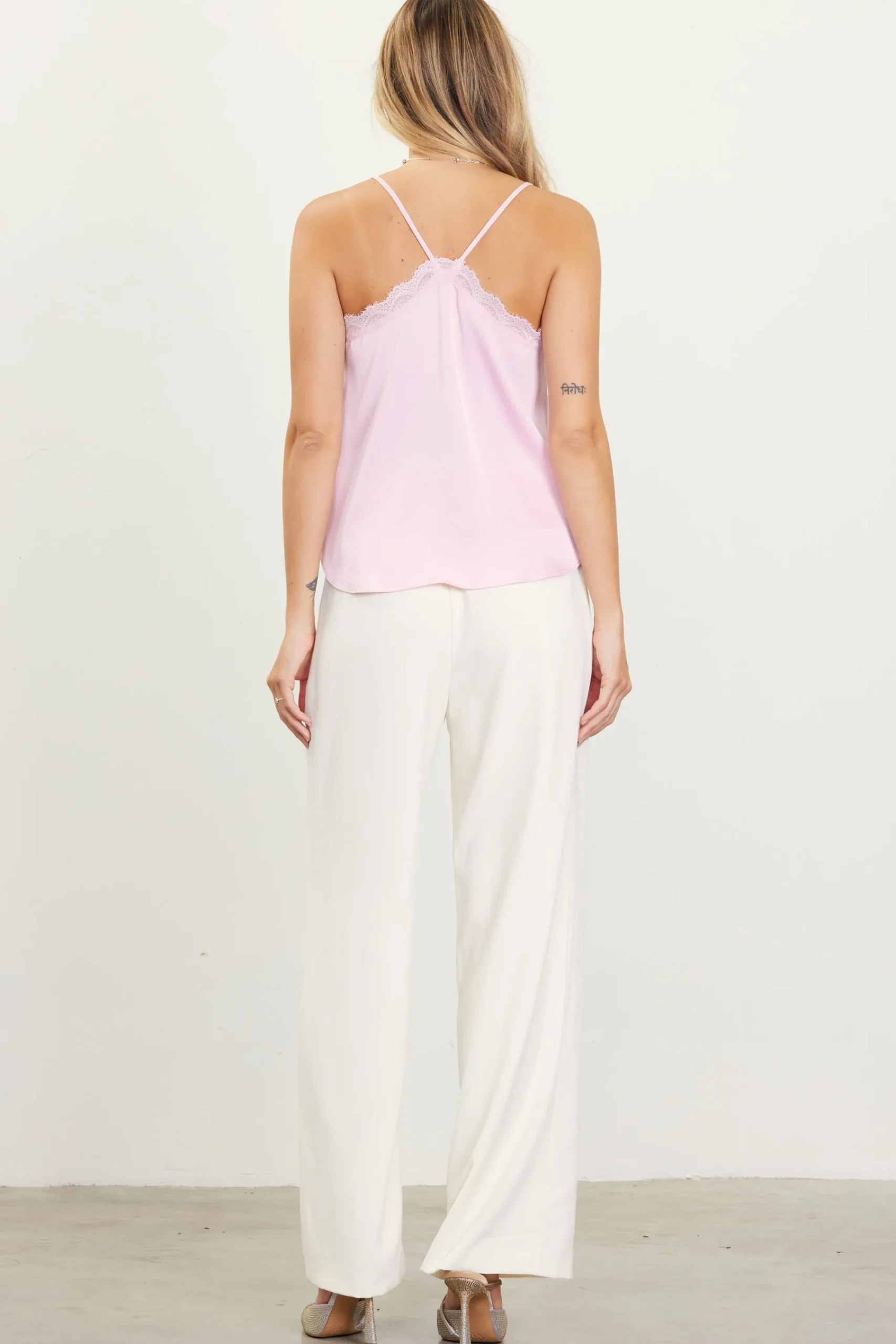 This satin cami top is sleek and relaxed, easily pairing with a wide range of outfits. Tonal eyelash lace accents the V-shaped neckline. Slim straps lead to a racer back.