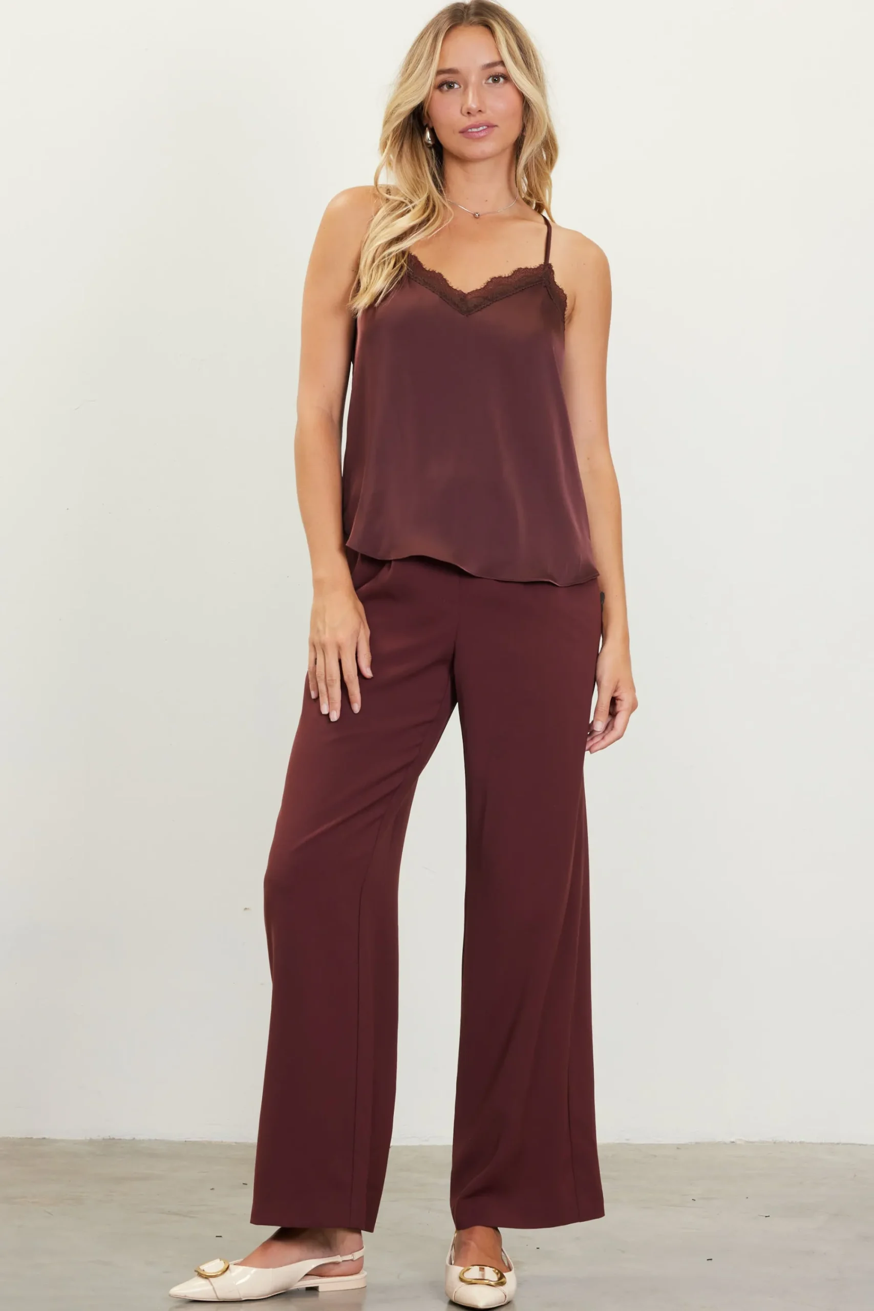 This satin cami top is sleek and relaxed, easily pairing with a wide range of outfits. Tonal eyelash lace accents the V-shaped neckline. Slim straps lead to a racer back.
