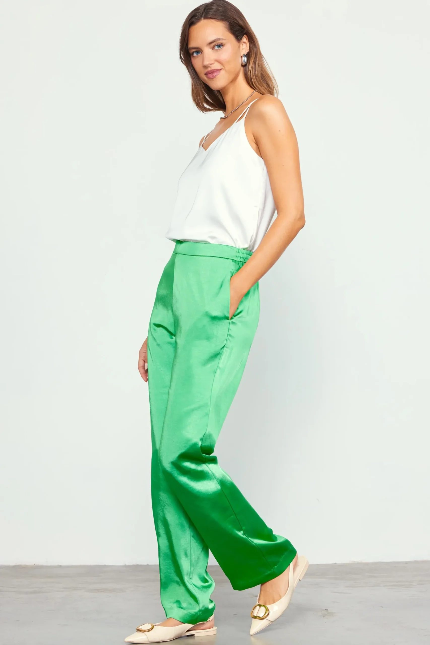 Simple yet sophisticated, these satin pants have a high waist and an easy straight-leg silhouette. The elasticized back waistband makes for an extra-comfortable fit.