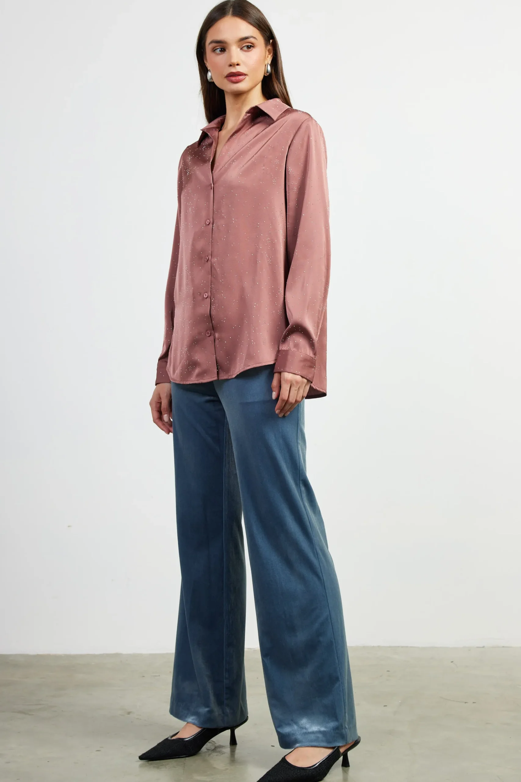 A sprinkling of shimmery, delicate stones catches the light on this satin button-up blouse. Open at the neckline, it’s got a relaxed fit that’s enhanced by a single pleat at the back.