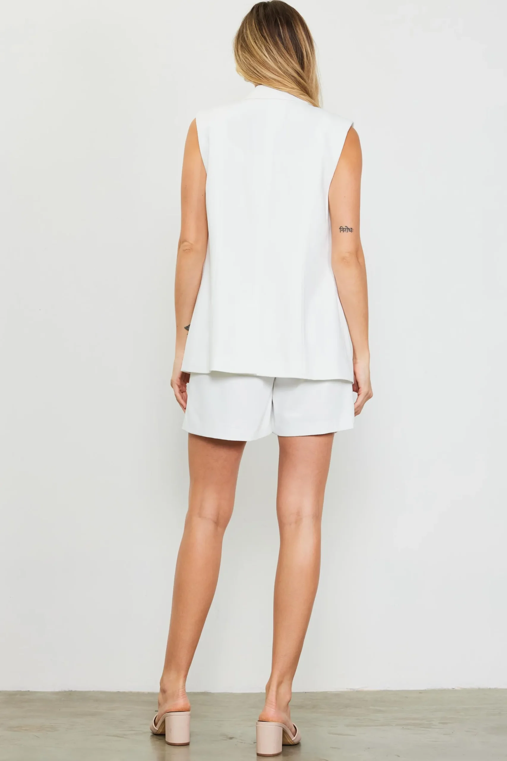 Menswear-inspired tailoring gets refreshed for the warmer months. This sleeveless blazer adds a sharp, pulled-together element to any look. Structured at the shoulders, it’s got notched lapels, tonal buttons, and flap pockets. A vented back hem eases the fit. Wear it as a set with the matching pleated shorts.
