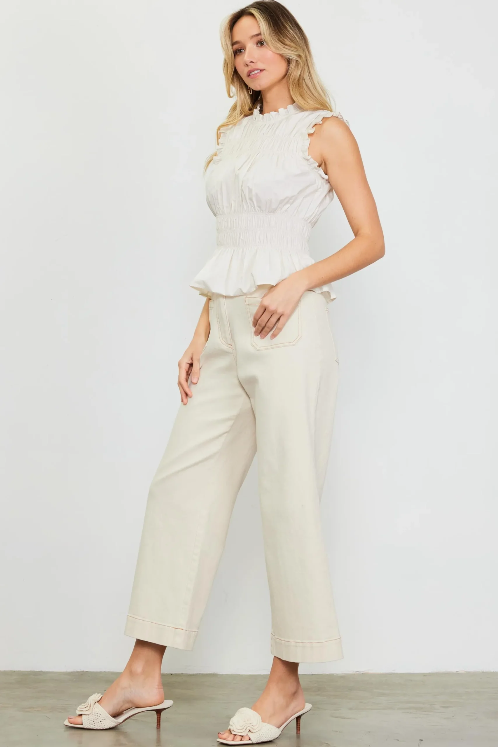 Smocking draws in the shape of this sleeveless top to create a flattering, feminine silhouette. Ruffle trim and a back keyhole finish the look.